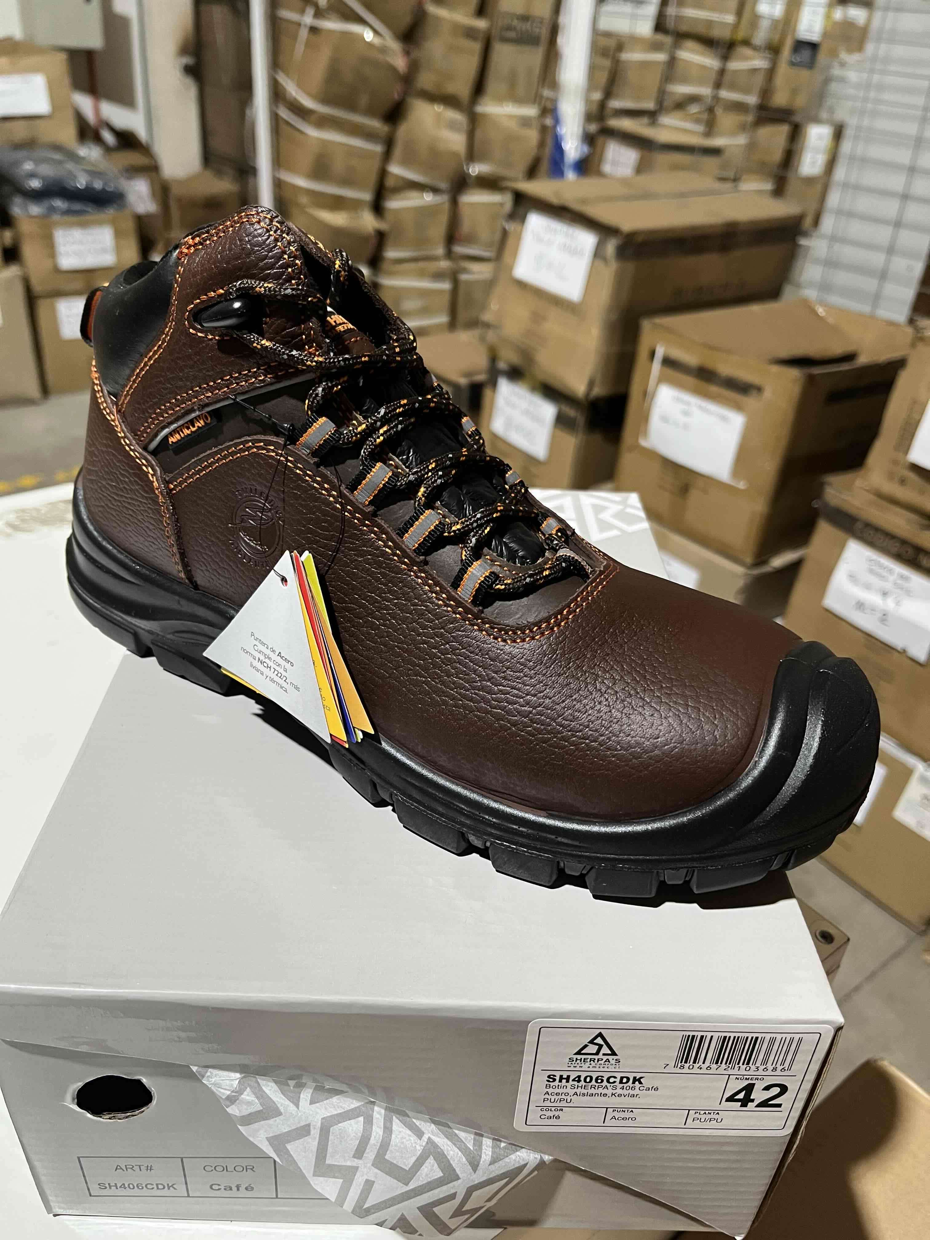 Calzado de seguridad marca Sherpa's, modelo SH417 ADK. Número: 42…. Cuenta con planta kevlar resistente a: hidrocarburos, antideslizante, anti-clavos, aislante eléctrico, costura reforzada y es 100% cuero. Cuenta con certificación CESMEC