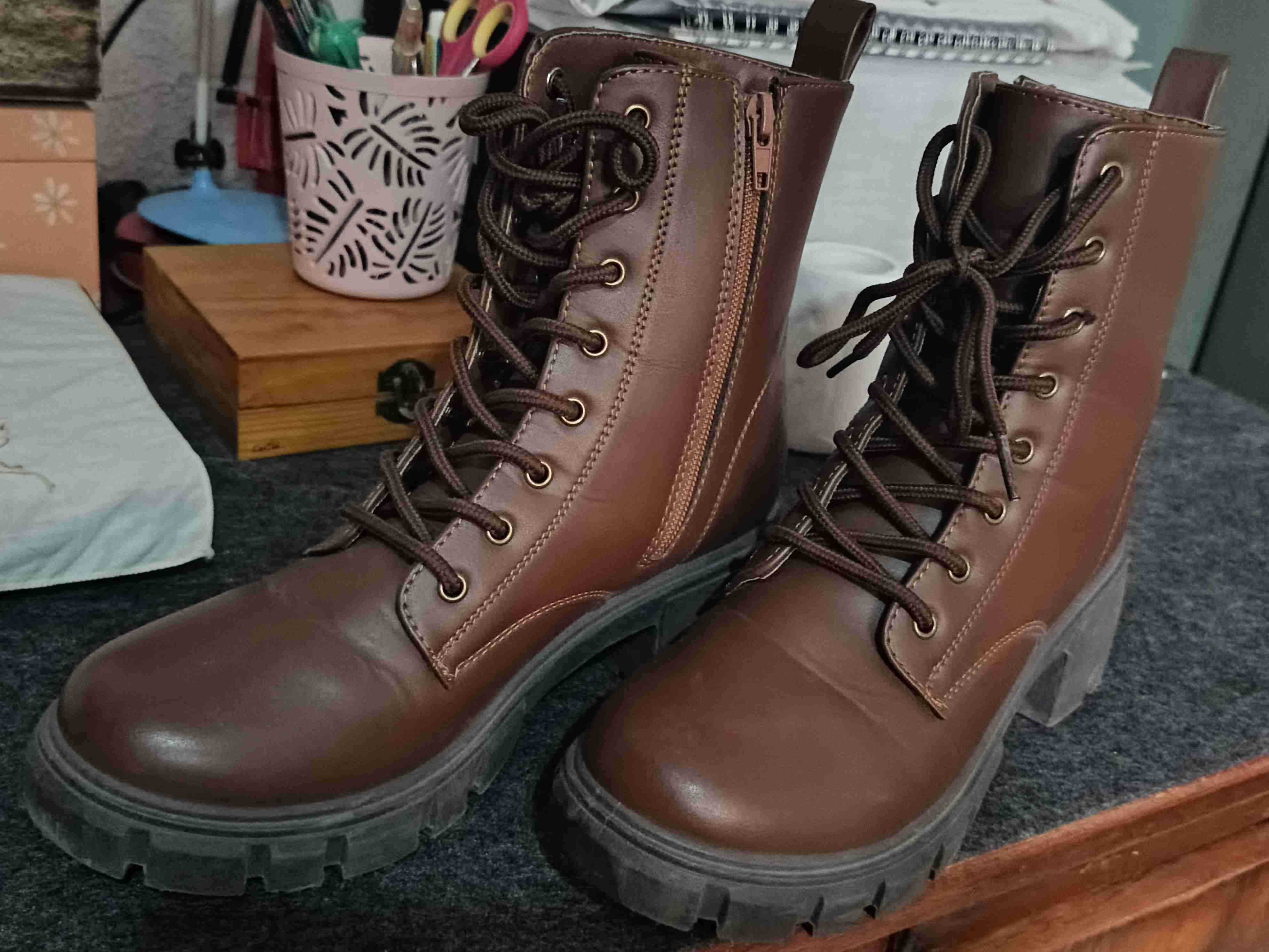 Botas de ecocuero marrón con cordones y cierre lateral, altura del taco 5cm aprox y cubre un poco mas arriba del tobillo😁 (1 postura) perfectas para el invierno.