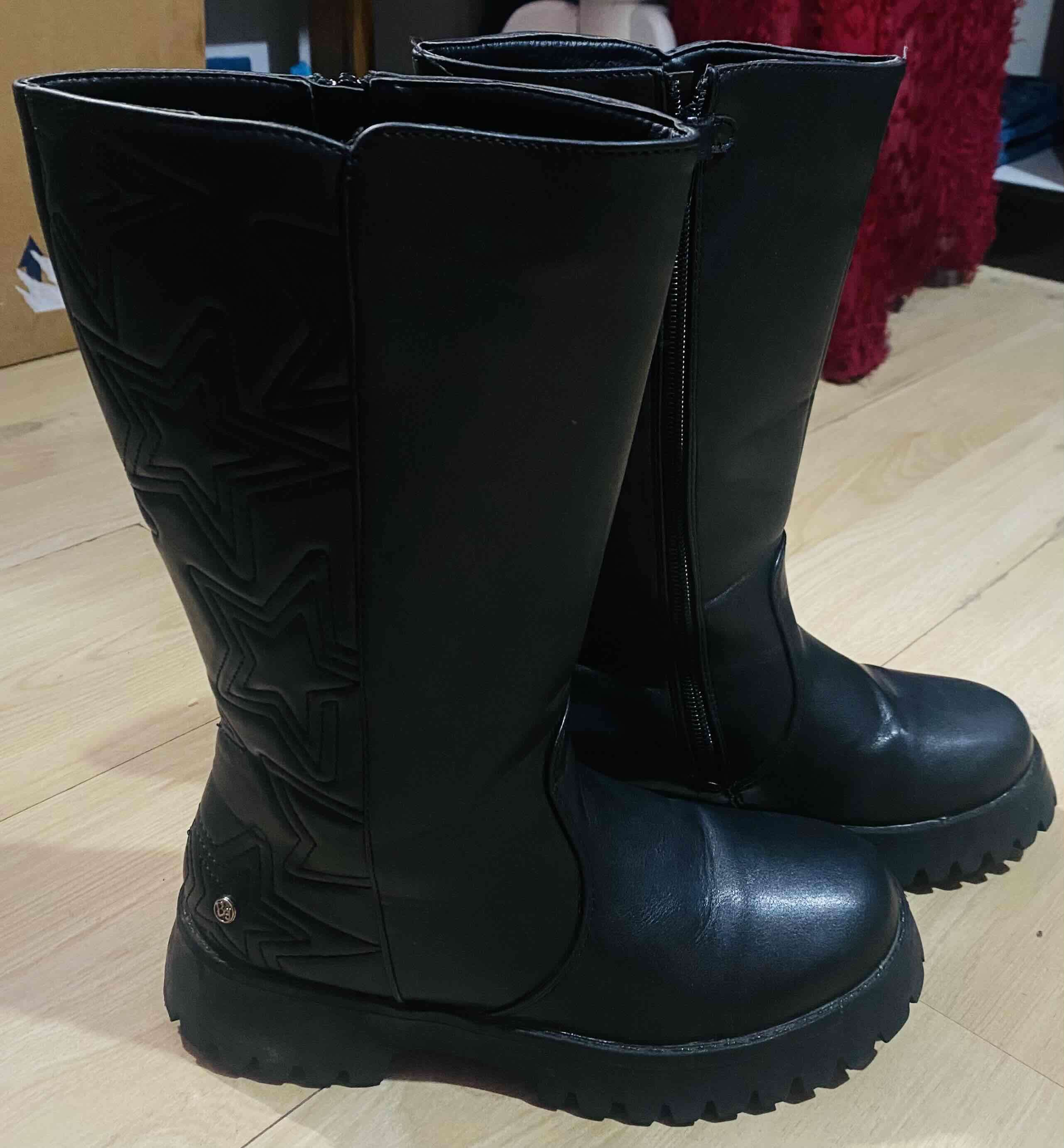 Botas negras de caña alta, perfectas para el invierno. Diseño con detalles en el costado. Buen estado, poco uso. Talla 35