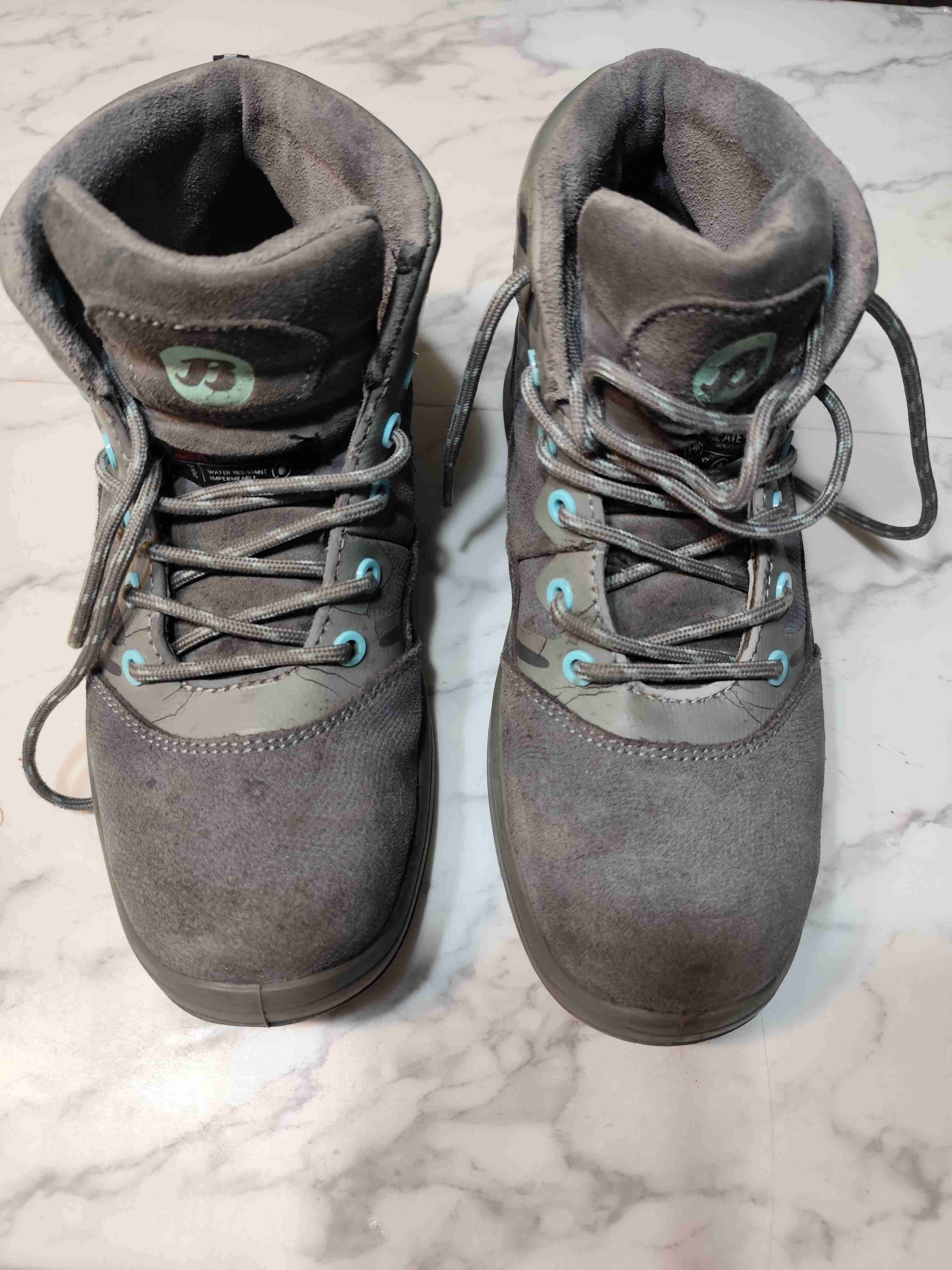 Botas o zapatos de seguridad grises y azul turquesa, con punta de hierro