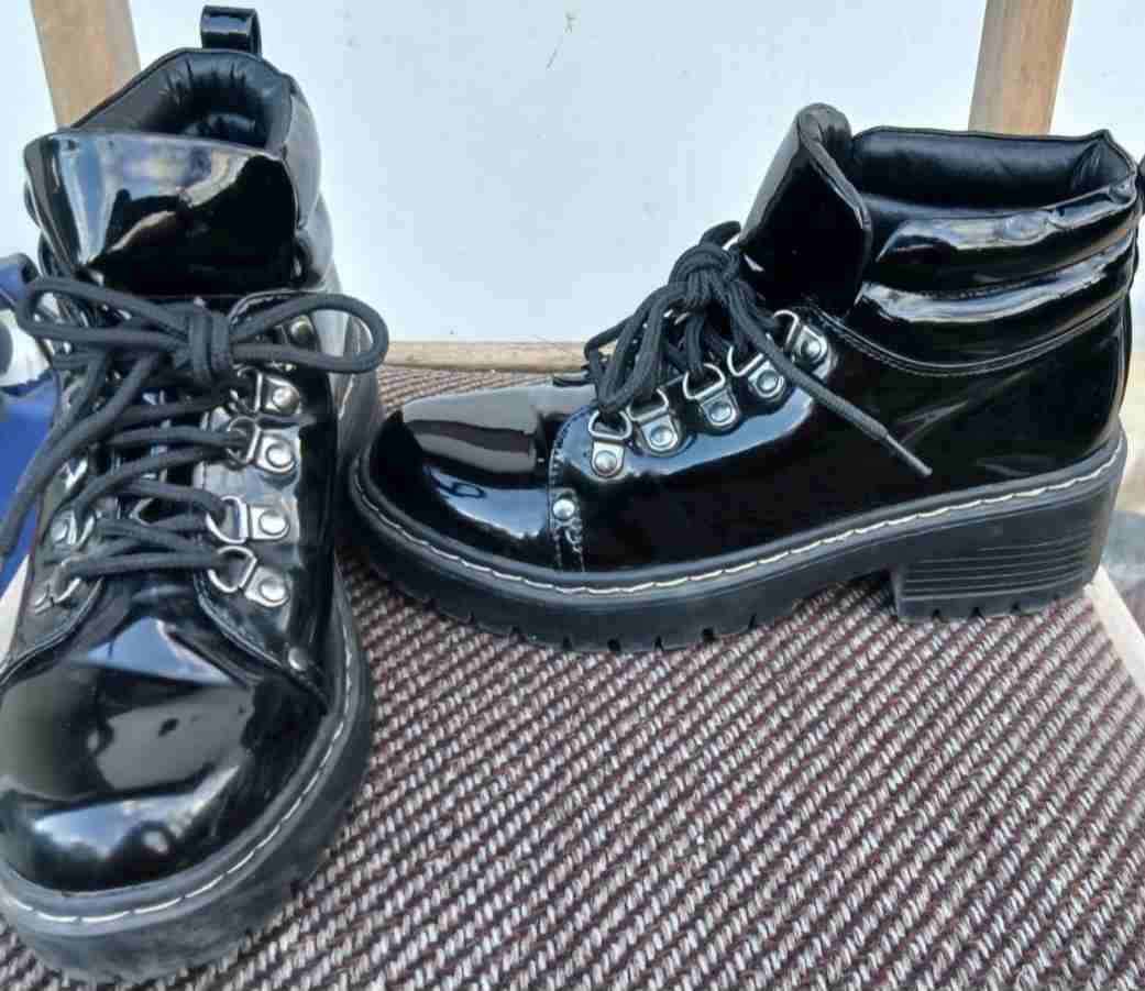 Botas negras de charol con detalles metálicos. Estado bueno, perfectas para estilo casual o urbano.