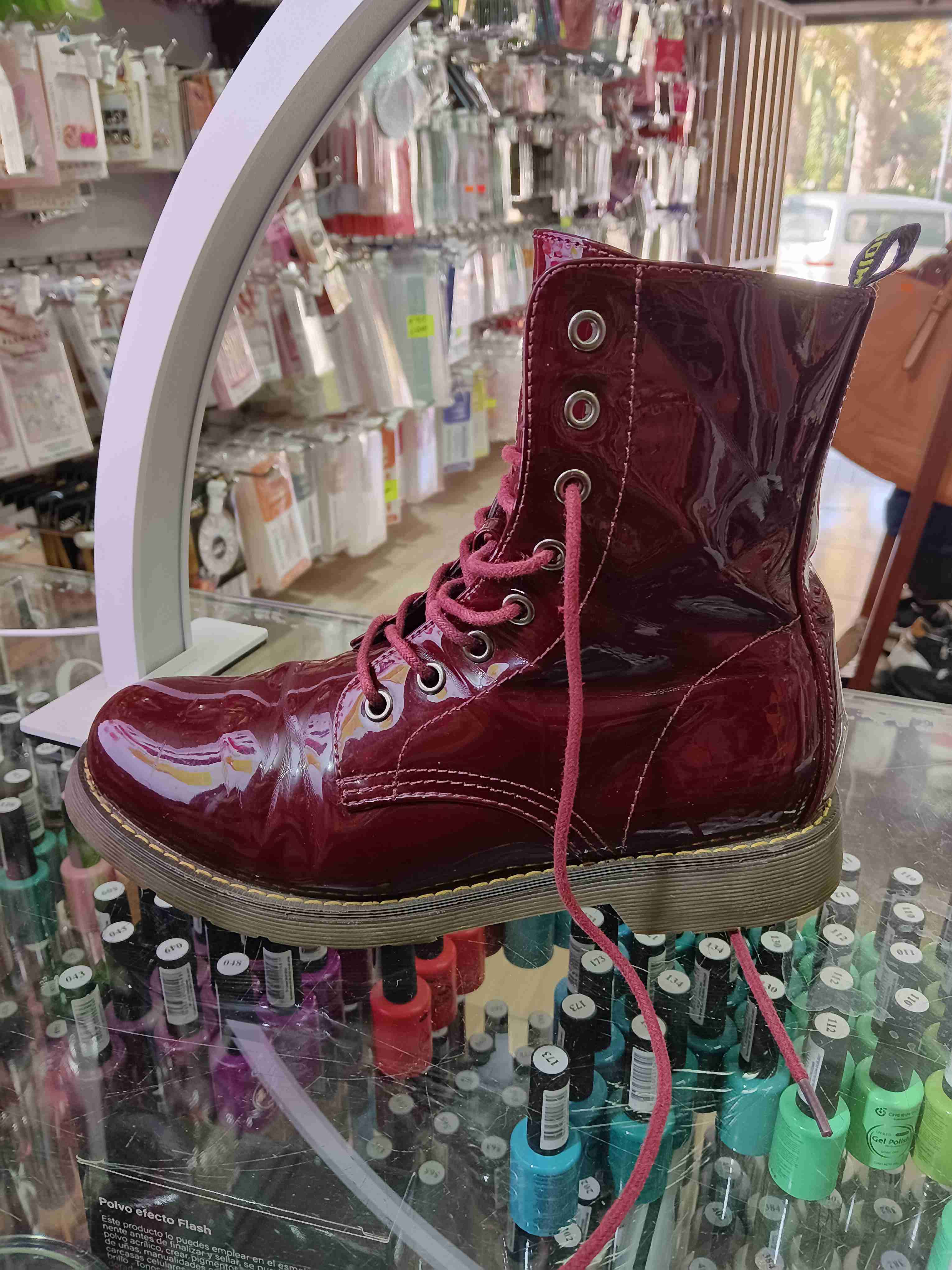 Bota de charol brillante en color burdeo Ideal para un look atrevido y moderno. Buen estado general.