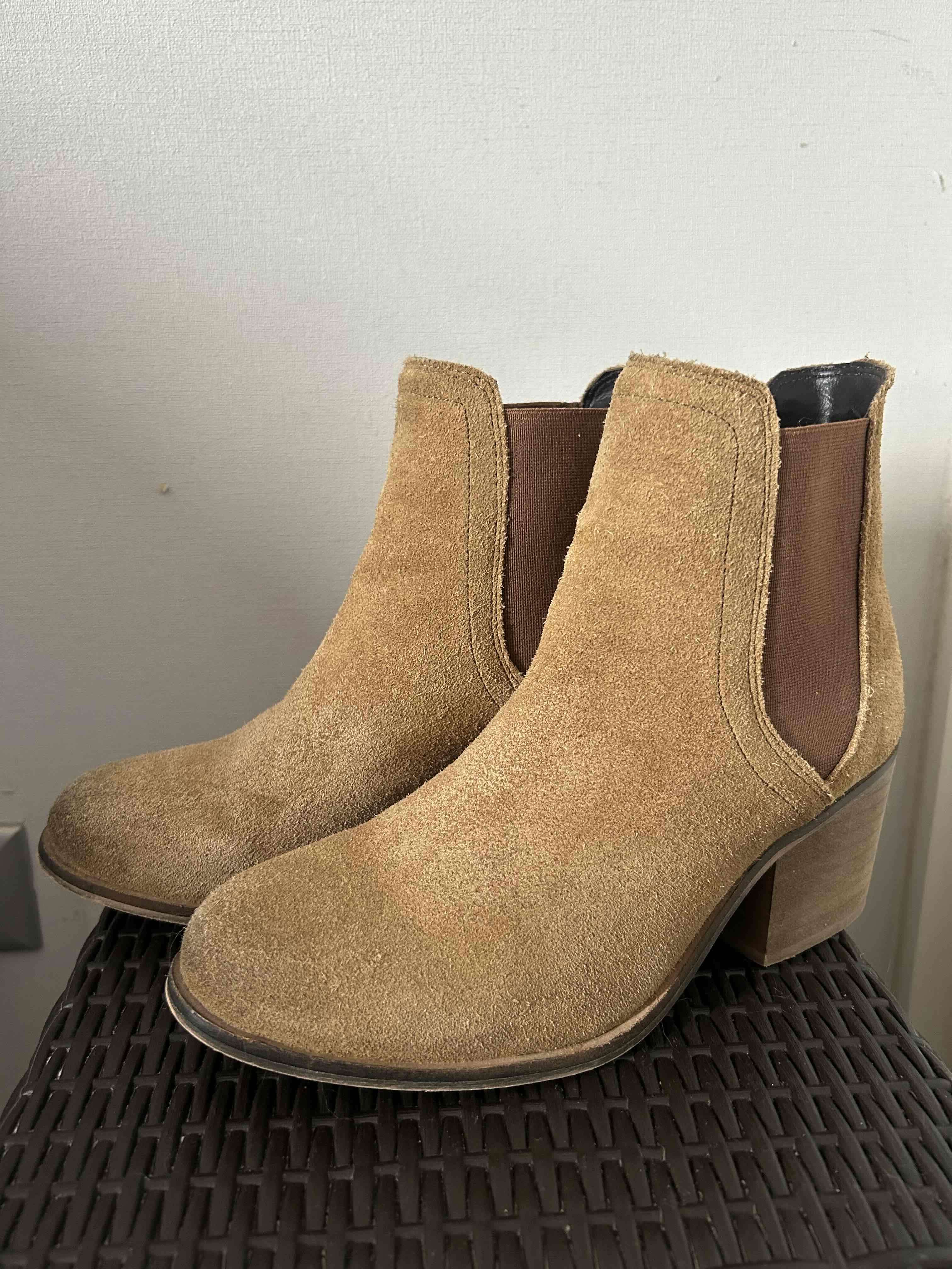 Botines de cuero en color marrón claro, perfectos para el día a día. En buen estado, con signos leves de uso. Marcas naturales de cuero ( no están sucias)