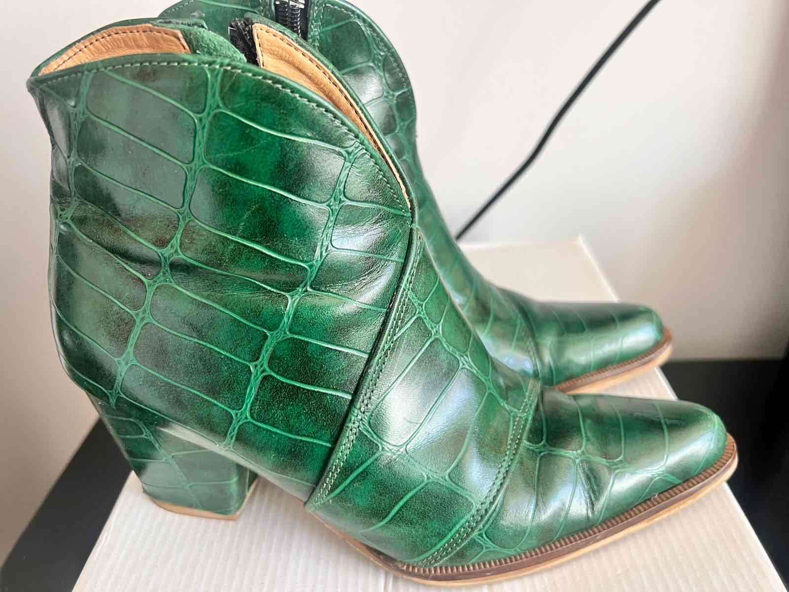 Elegantes botines verdes con diseño tipo cocodrilo. Perfectos para un look distintivo y elegante. En buen estado. Marca Criss Araos