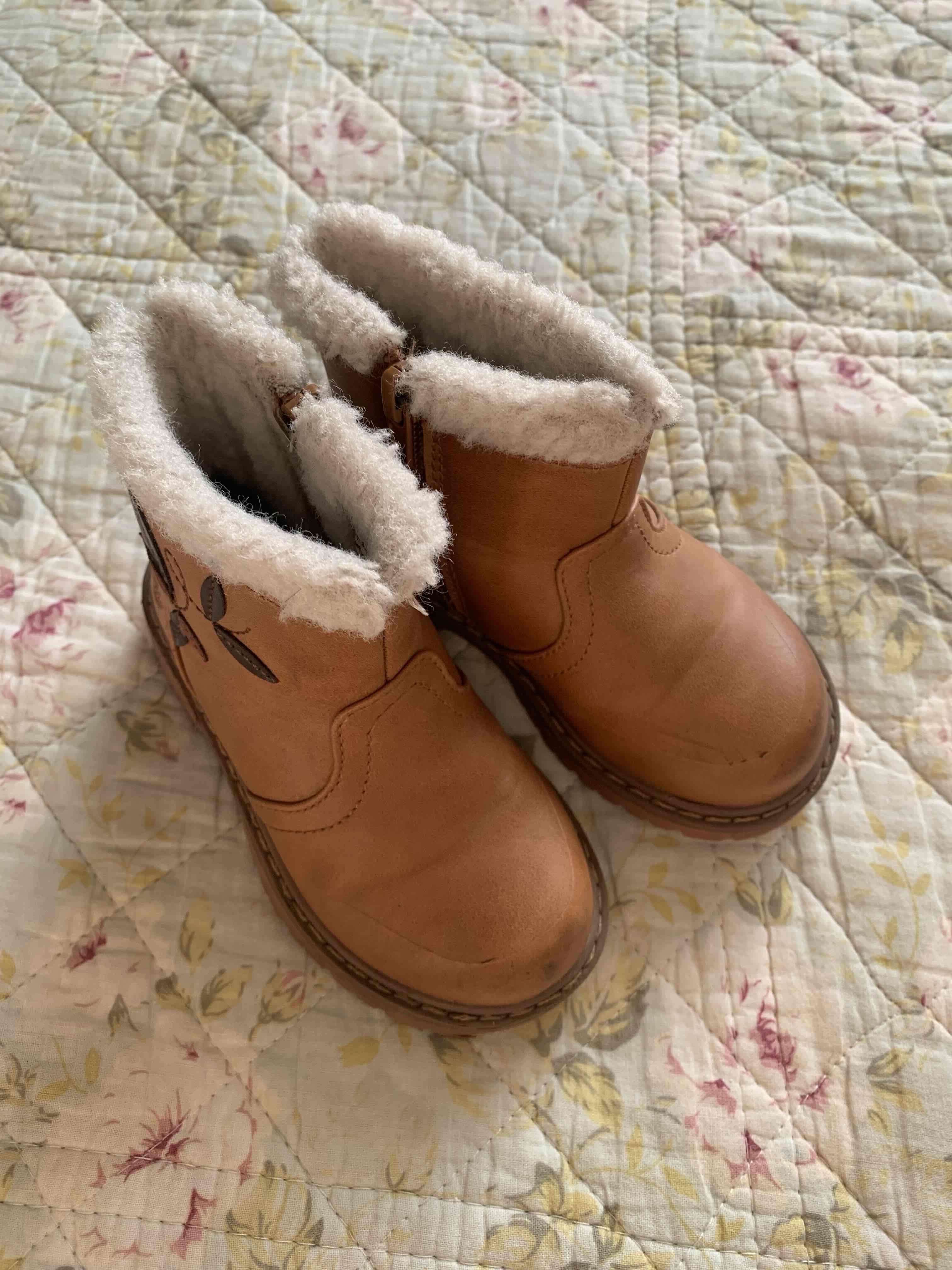 Cómodos botines de niño, color cuero con forro interno de peluche ideal para el invierno. Buen estado general.