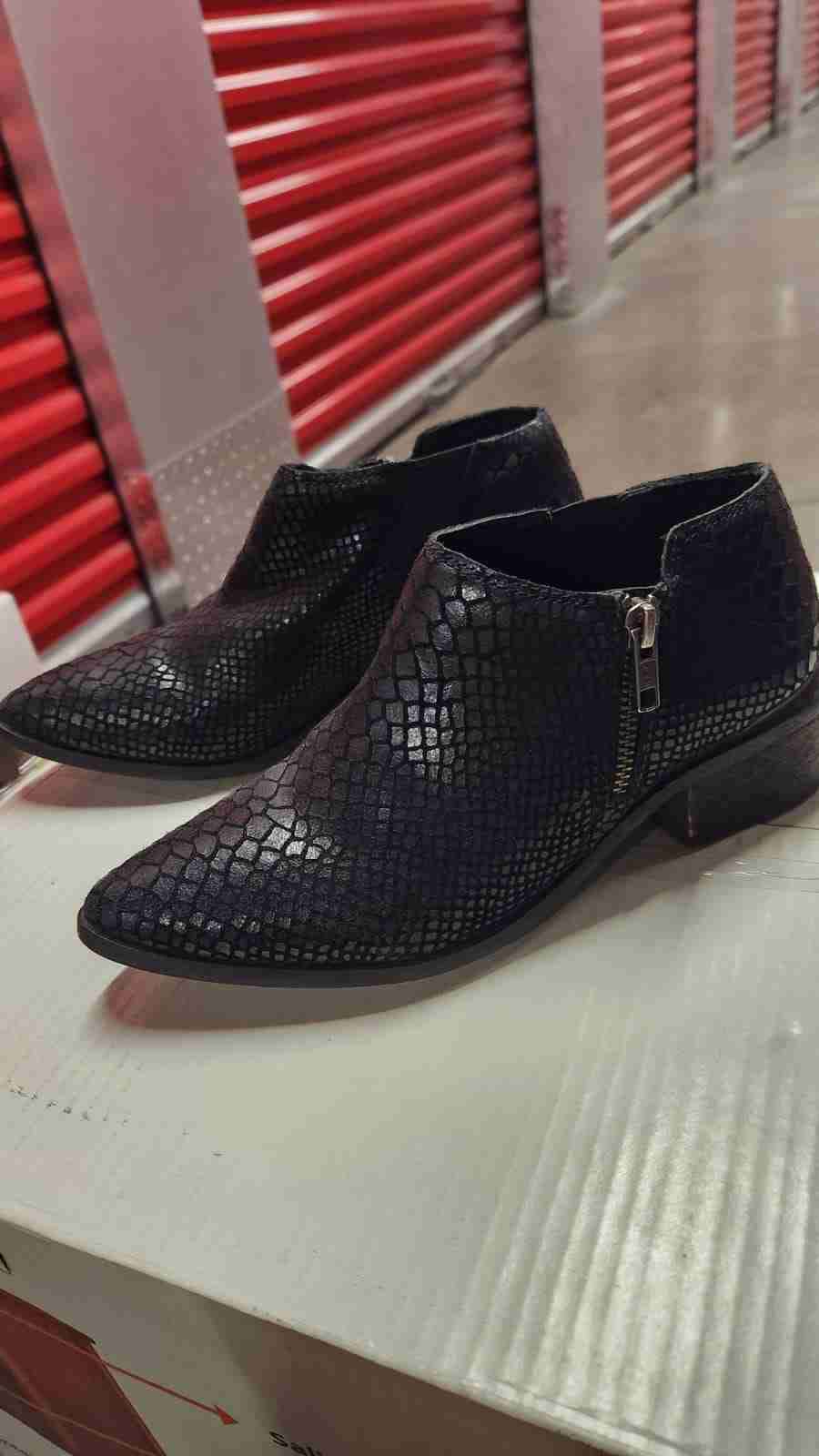 Botines negros con textura de reptil, elegantes y modernos. Perfectos para ocasiones casuales o formales.