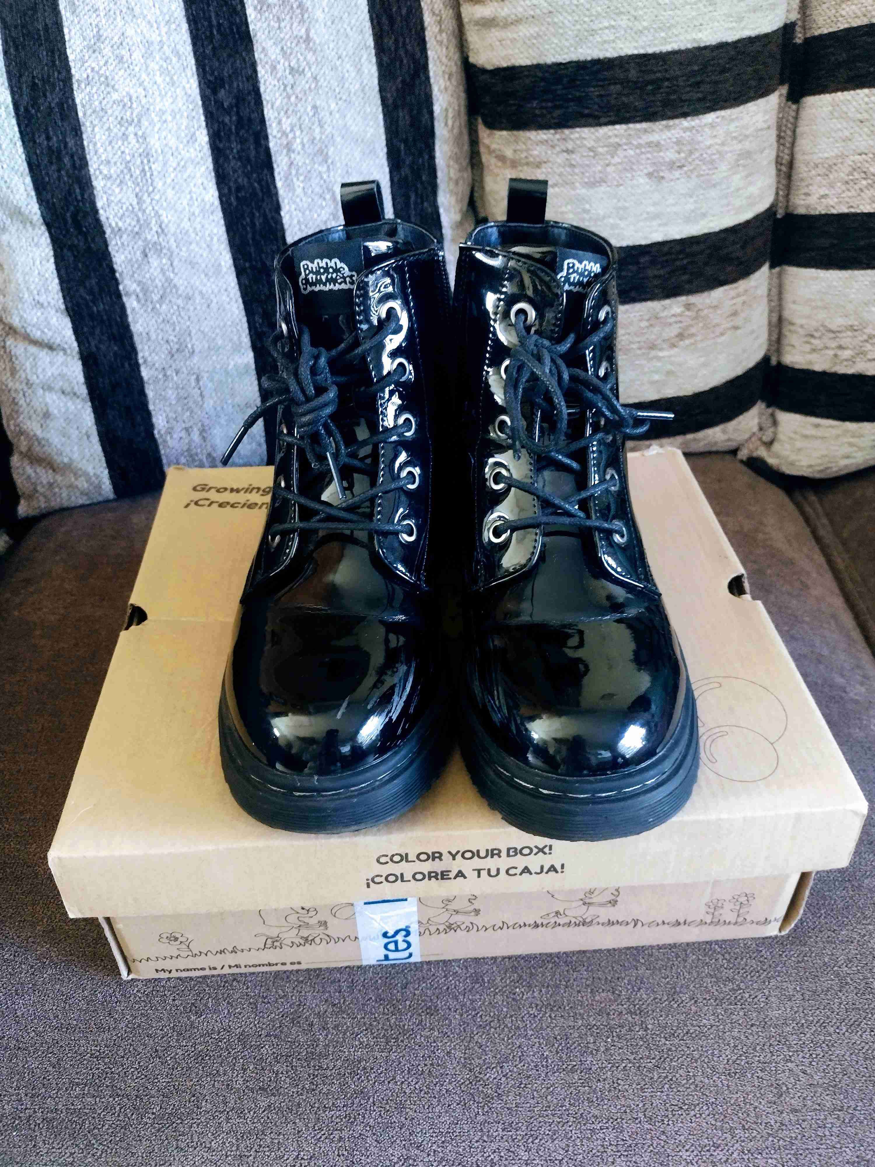 Botines de charol negros para niña, en buen estado. Perfectos para ocasiones formales. Talla 36, pequeño detalle visible en la foto ( un poco pelado en un costado)