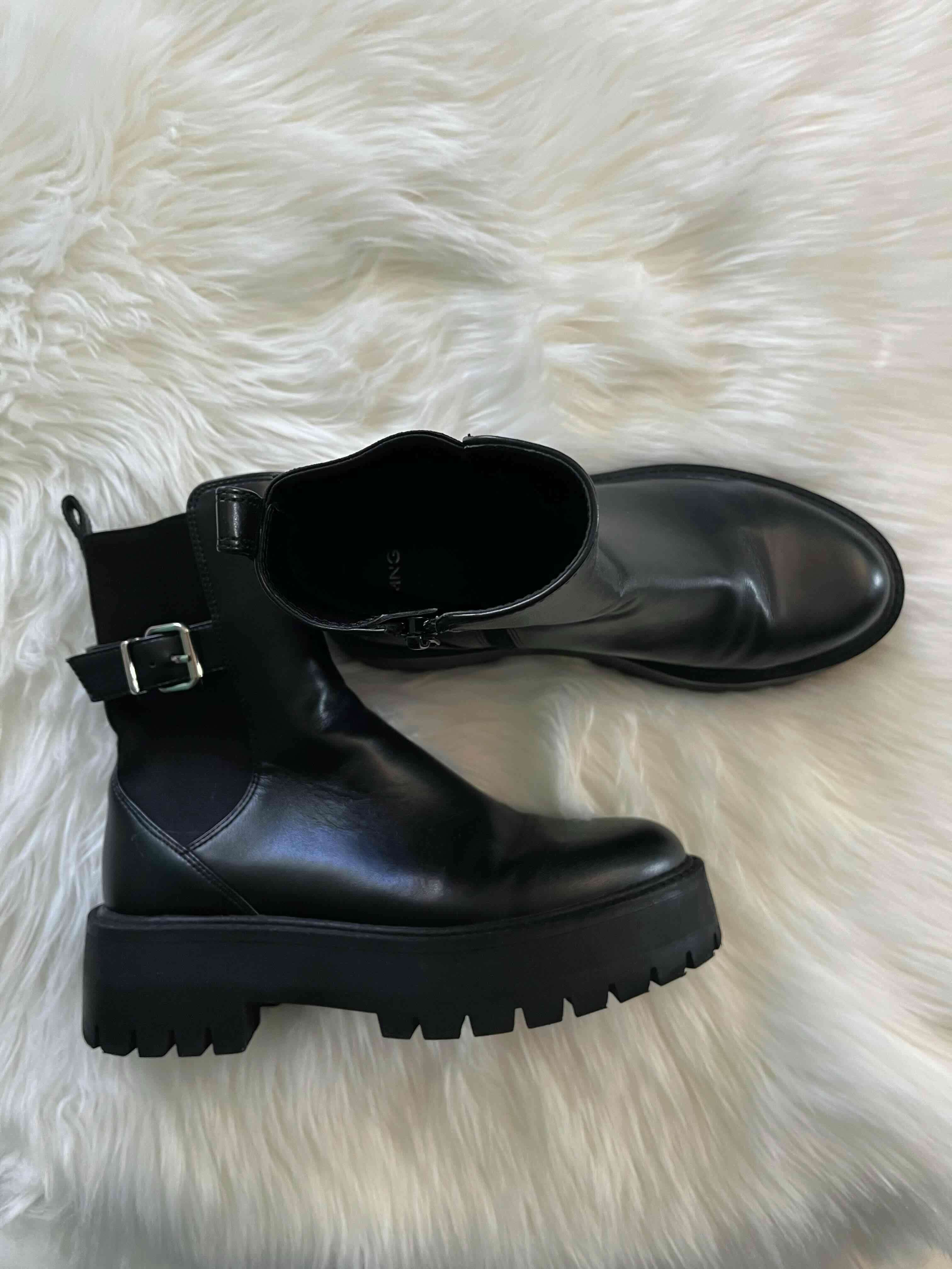 Botines de cuero negro en buen estado, ideales para uso diario. Tienen una hebilla decorativa lateral.