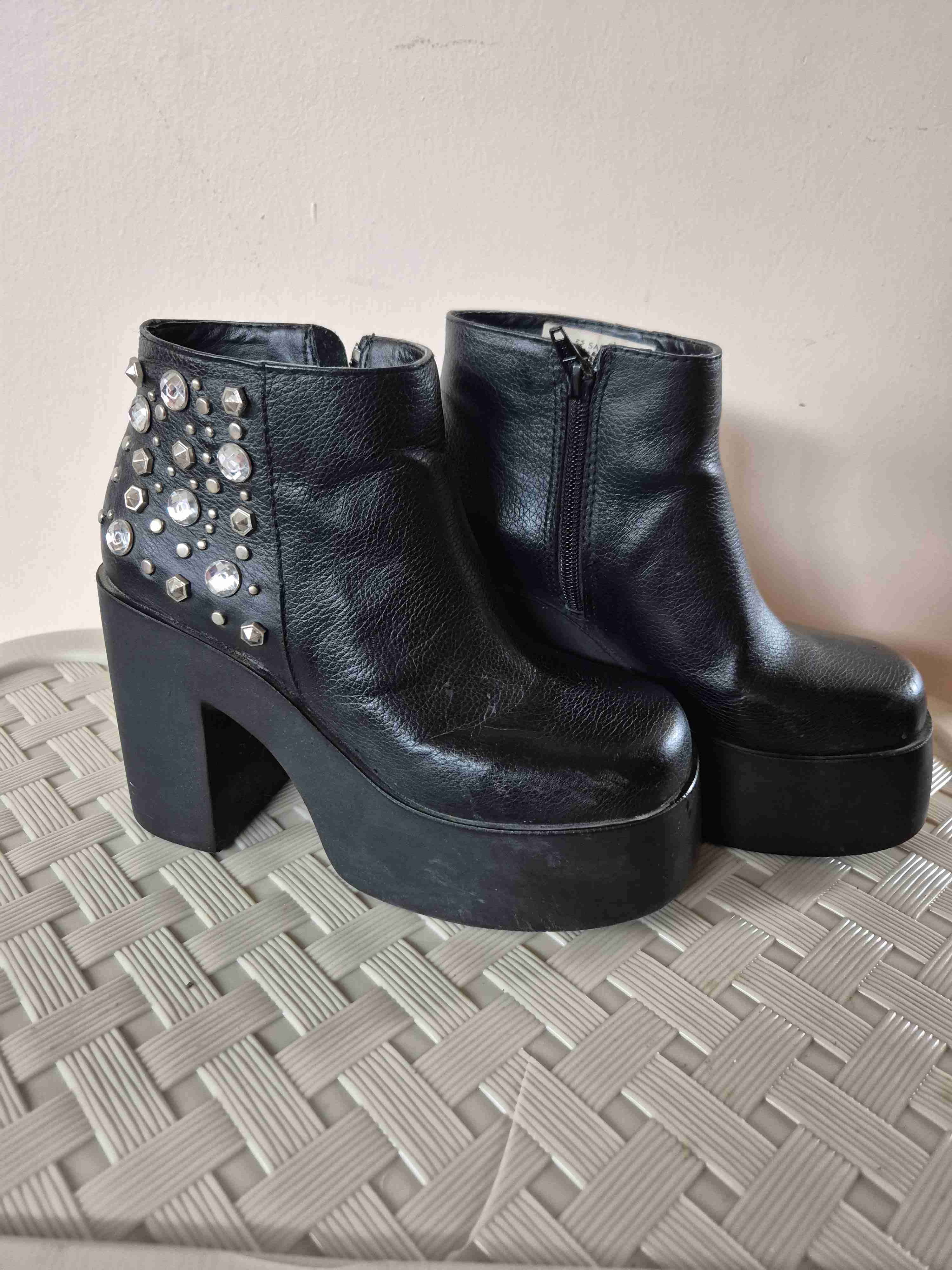 Botines de cuero negro con tachas brillantes. Perfectos para un look moderno y elegante. En buen estado general. Talla 35. Marca sarkany.