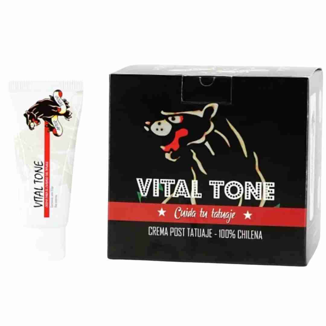 VITAL TONE CREMA PARA EL CUIDADO DEL TATTOO Su presentación de 30gr es lo mejor que puedes usar para obtener una cicatrización perfecta, no mancha la ropa, fácil de transportar y usar. Contiene dexpantenol provitamina B5 que entrega a tu piel los componentes necesarios para una mejor recuperación de la piel tatuada. No te dejes engañar por su presentación, es una pequeña maravilla, un tubo contiene la cantidad necesaria para cicatrizar un tatuaje de 20cm.