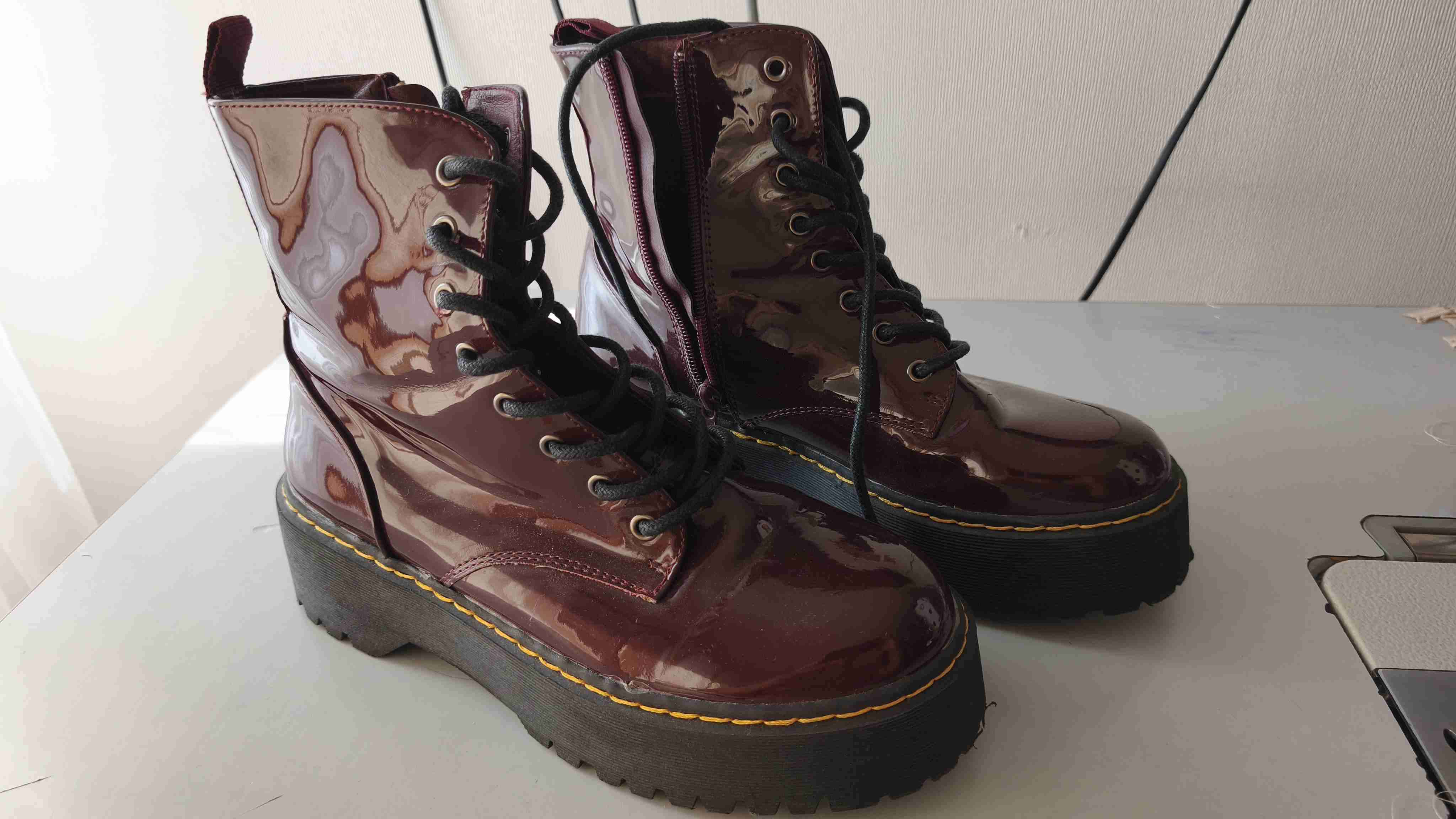 Botas de charol en color burdeo brillante, ideales para un look audaz. En buen estado, con plataforma gruesa y cordones negros.