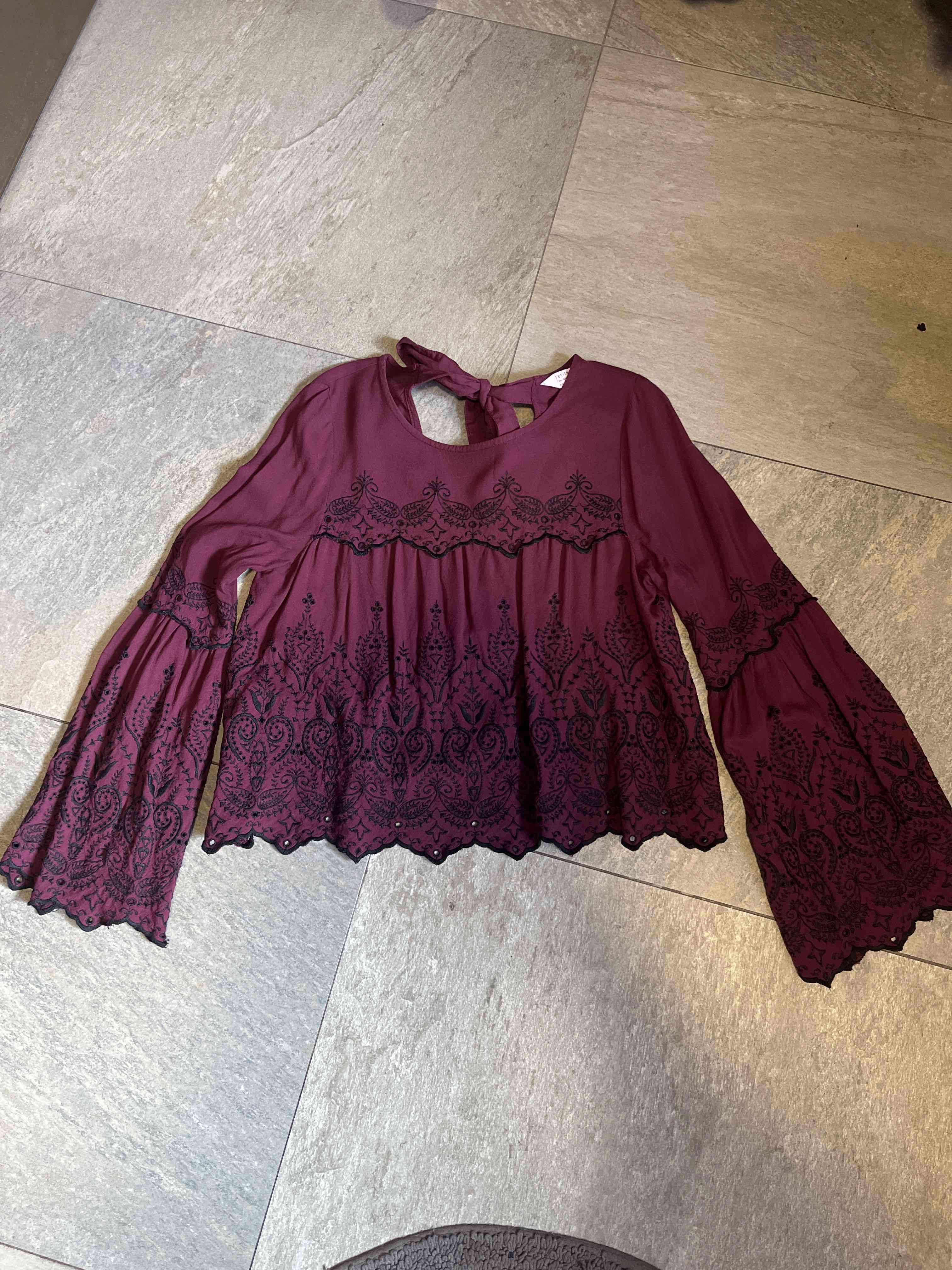 Hermosa blusa bordada en color burdeos, ideal para ocasiones especiales. En buen estado con detalles únicos en las mangas.