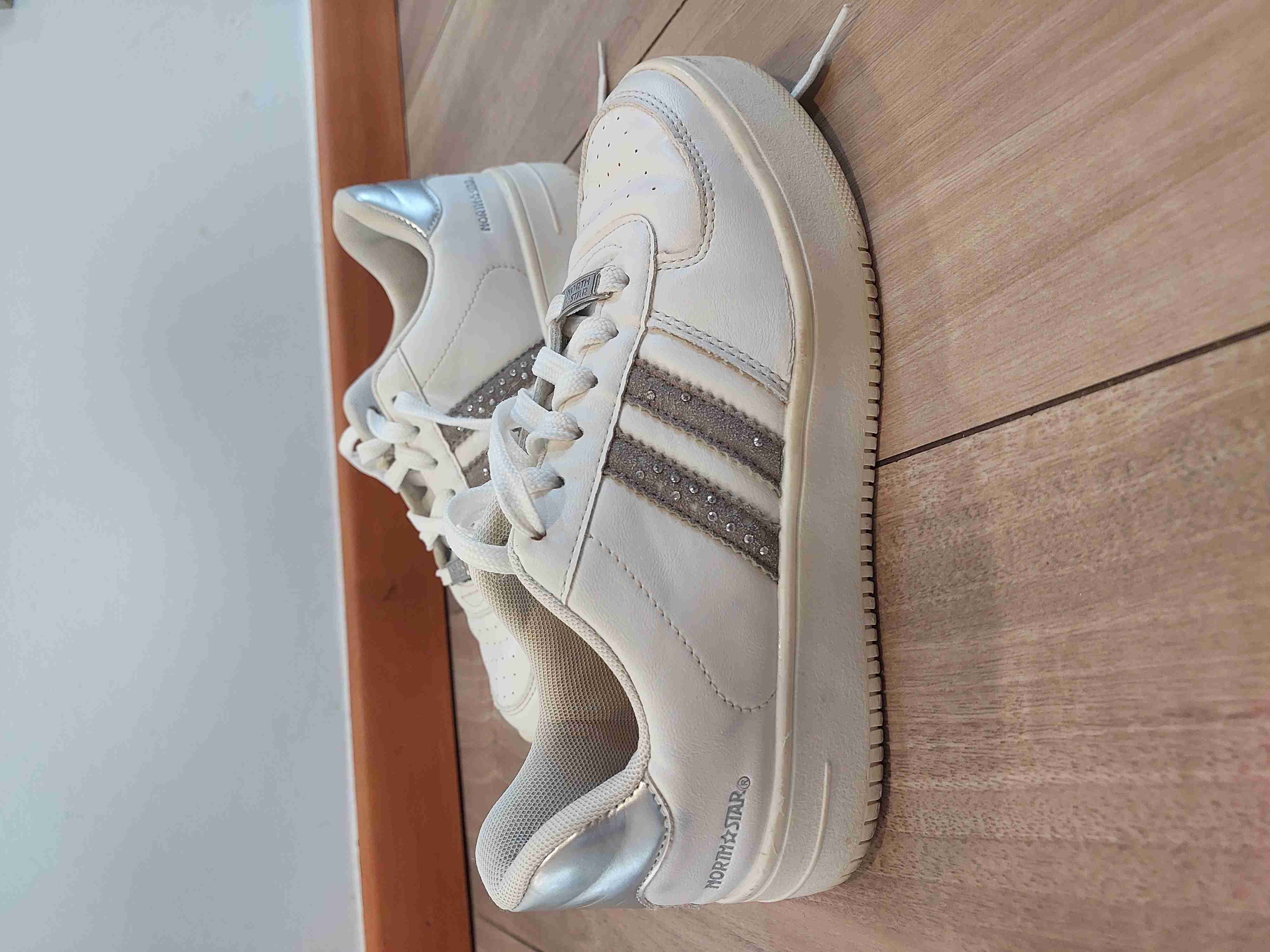 Zapatillas casuales blancas en buen estado, perfectas para el uso diario. Su diseño cómodo y moderno las hace ideales para combinar.