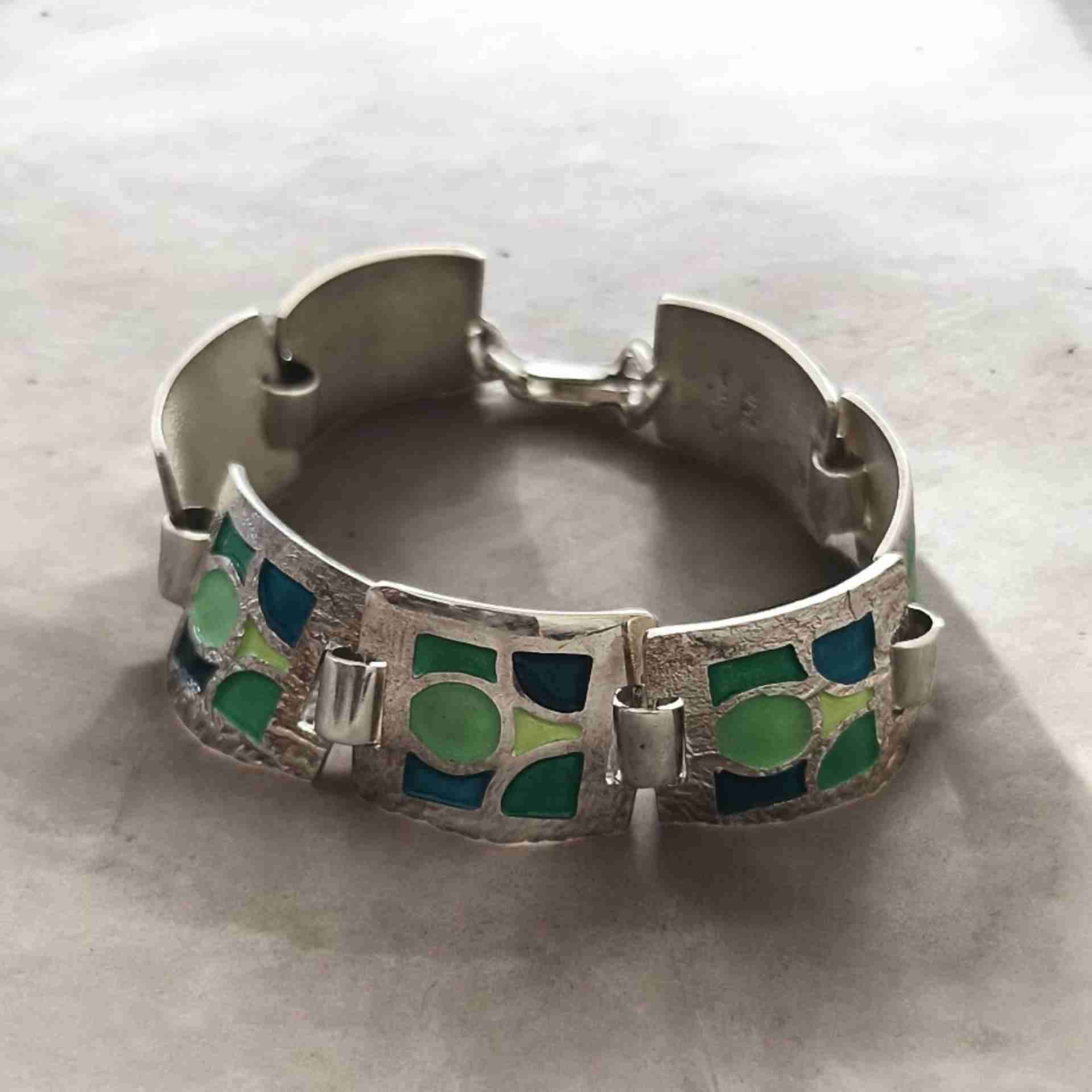 Brazalete de estilo moderno en plata 950 marca Rometsch con aplicaciones estilo mosaico en tonos verdes con gancho de seguridad. Nuevo en su caja original. Valor joyería $197.000