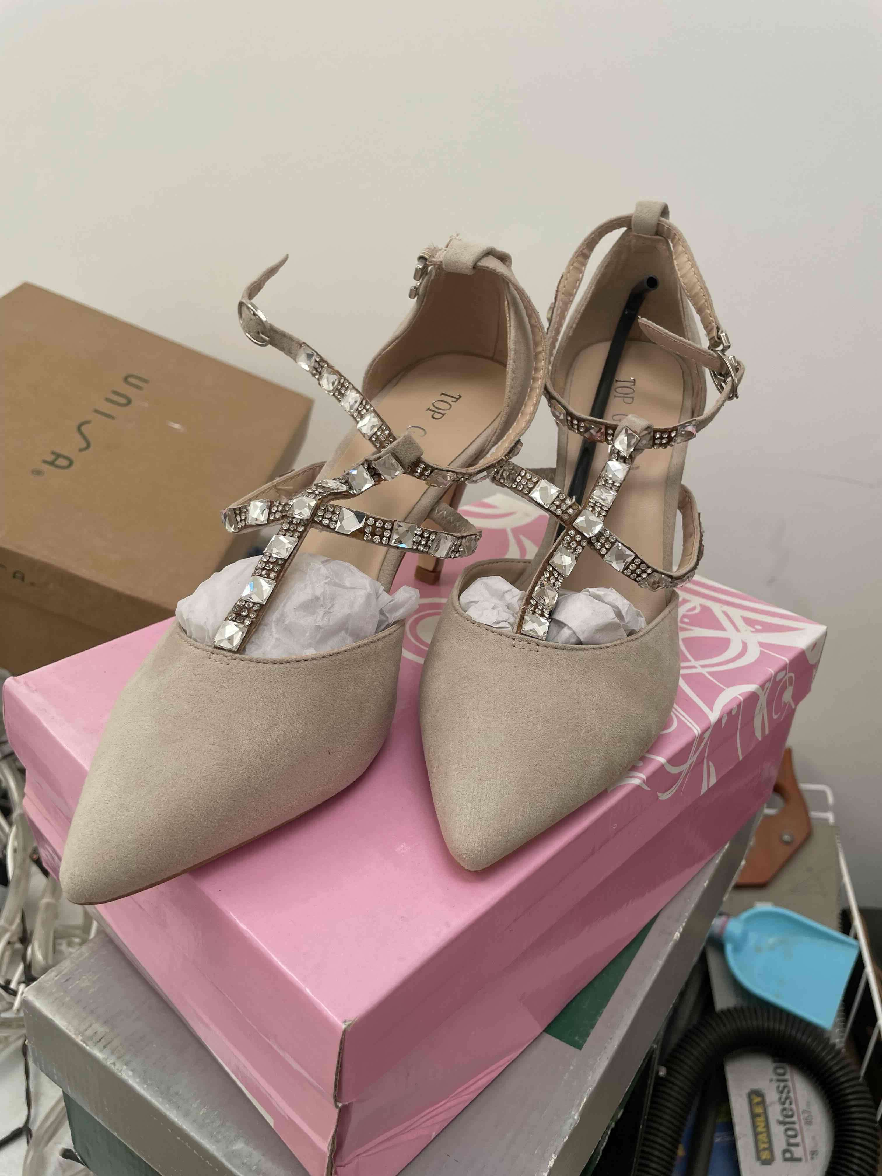 Elegantes zapatos de tacón en beige, adornados con brillantes. En buen estado, perfectos para eventos formales.