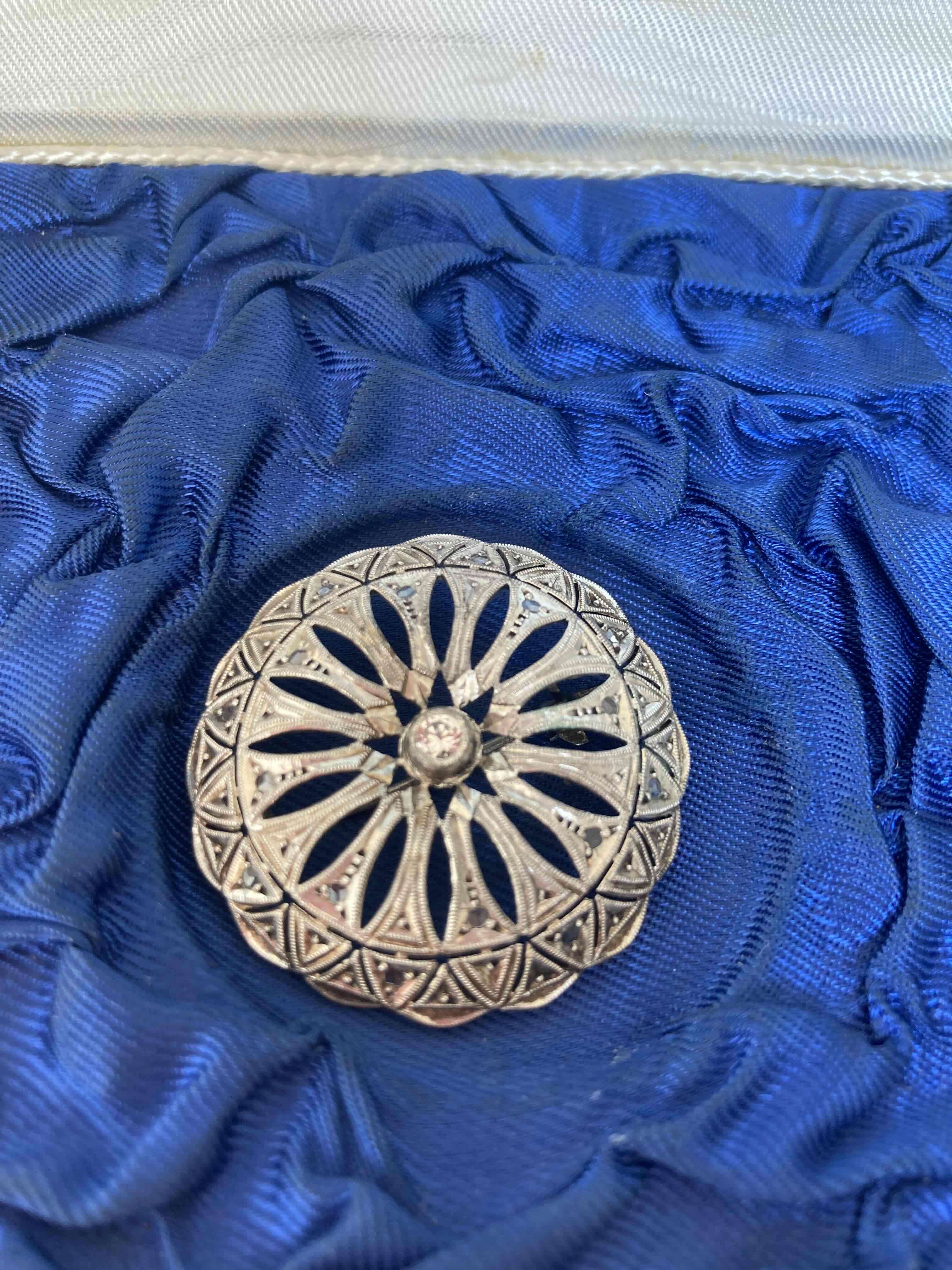 Broche Art Deco de filigrana de plata, posiblemente del estilo conocido como botón holandés (Zeeuwse Knoop). Material: Plata (plata 835 según ejemplares similares). Técnica: Filigrana hecha a mano. Diseño: Circular con patrón geométrico y incrustaciones de circonio .