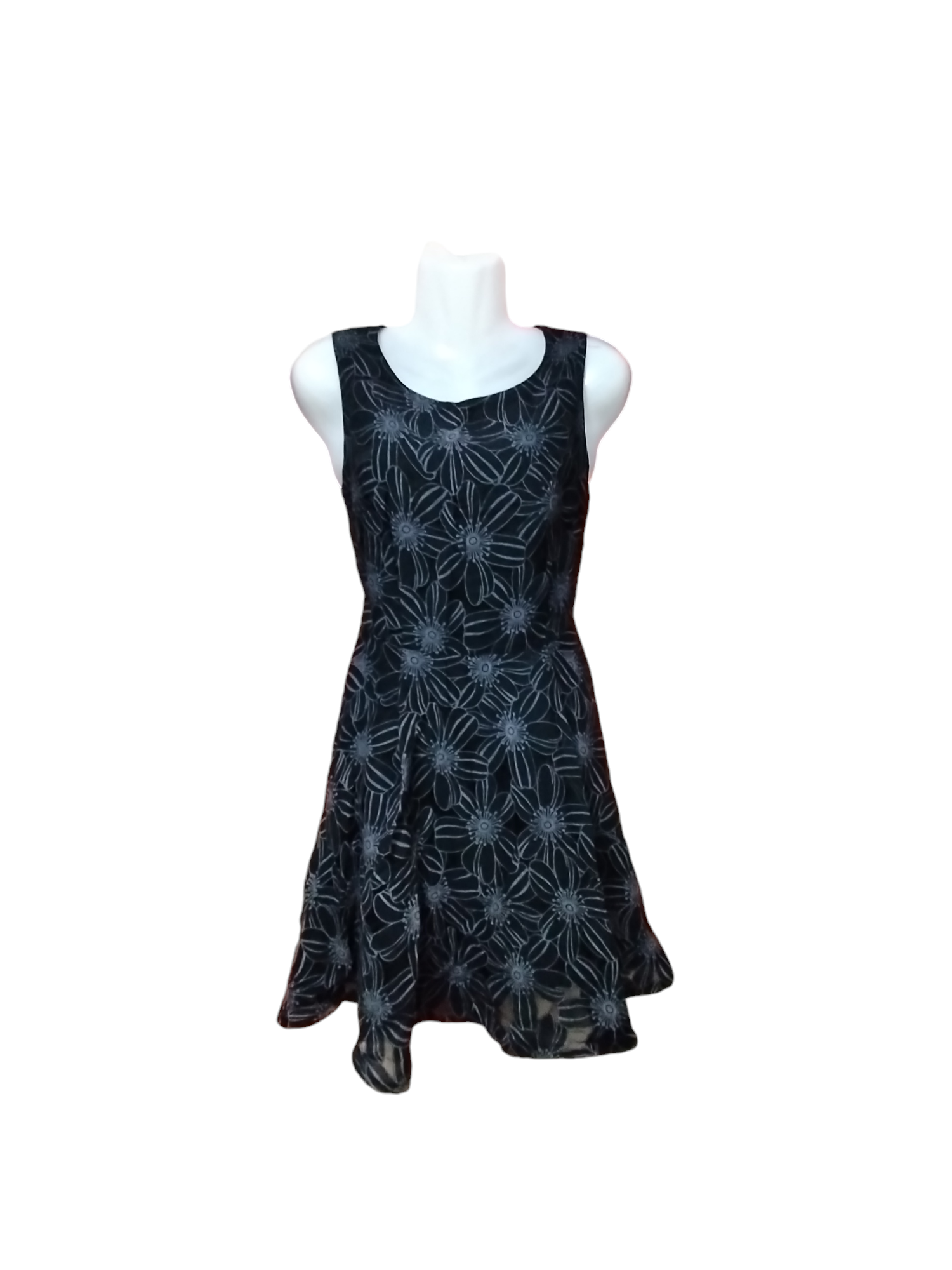 Elegante vestido negro con diseño de flores, ideal para eventos y salidas. Talla XS.