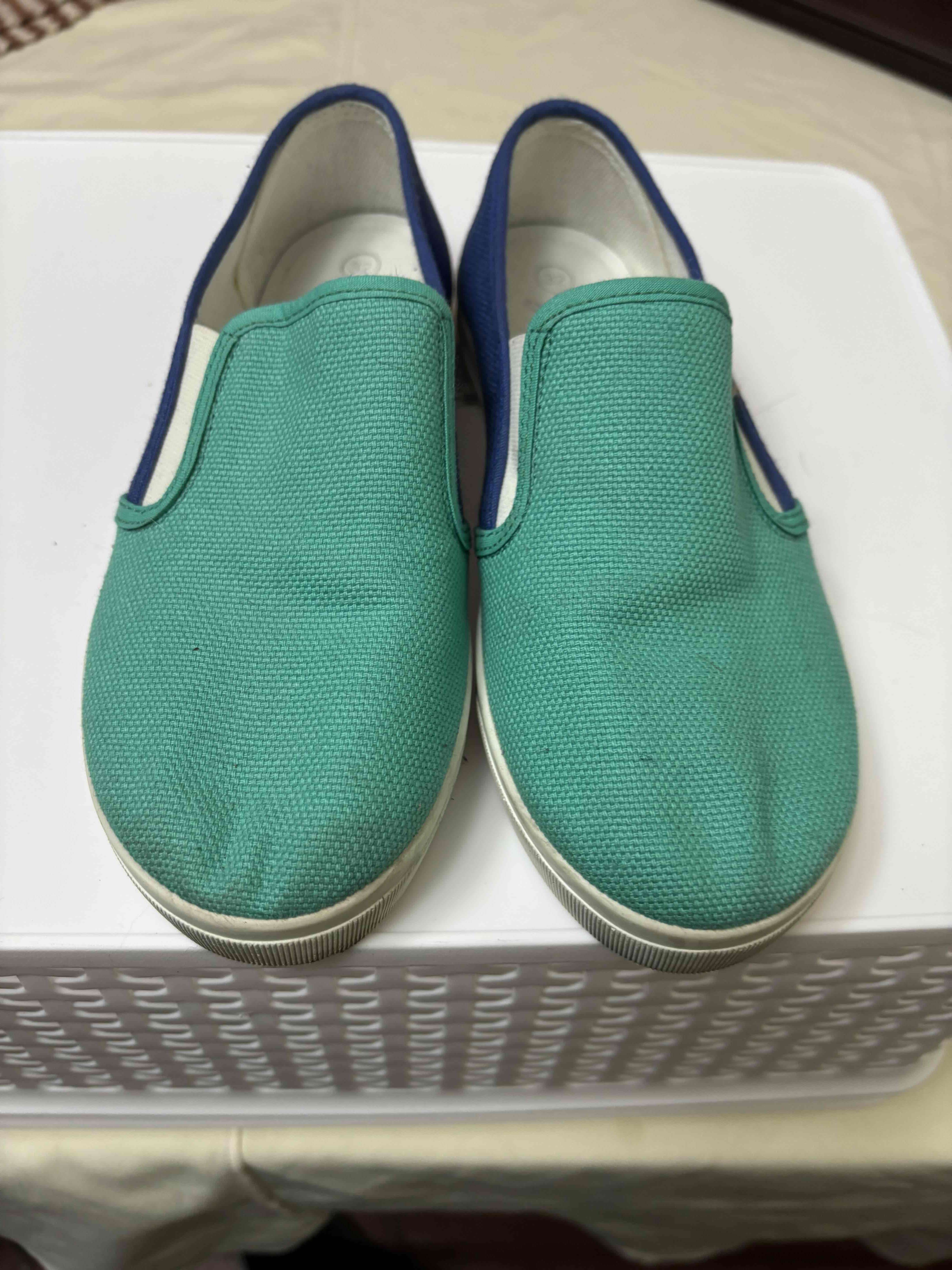 Zapatillas de lona color verde con detalles azules. En buen estado, ideales para el uso diario.talla 32