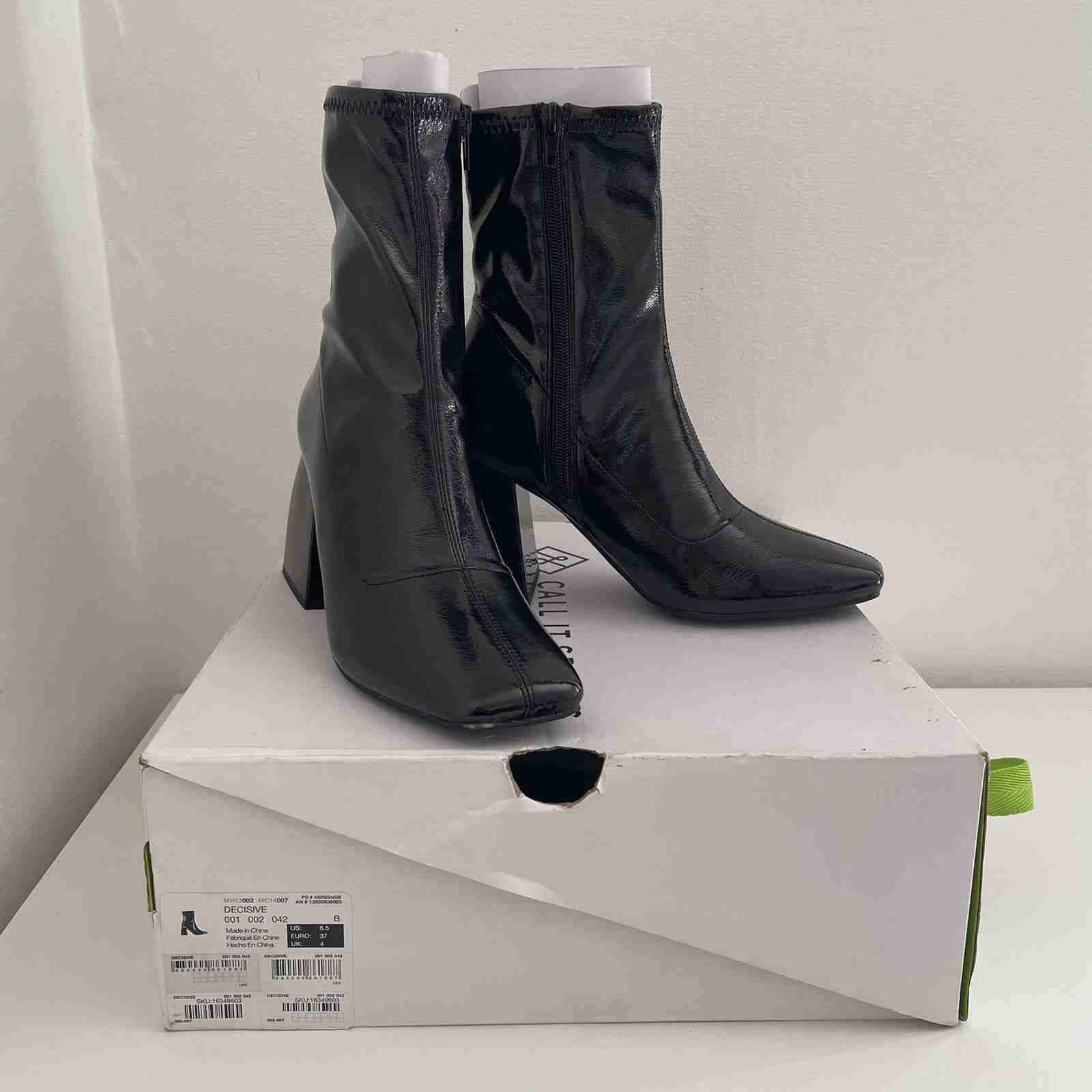 Botines negros de charol con punta cuadrada y tacón de bloque. Marca Call It Spring (submarca de Aldo), modelo "DECISIVE". Talla N° 37 Nuevos , solo probados, con caja original.