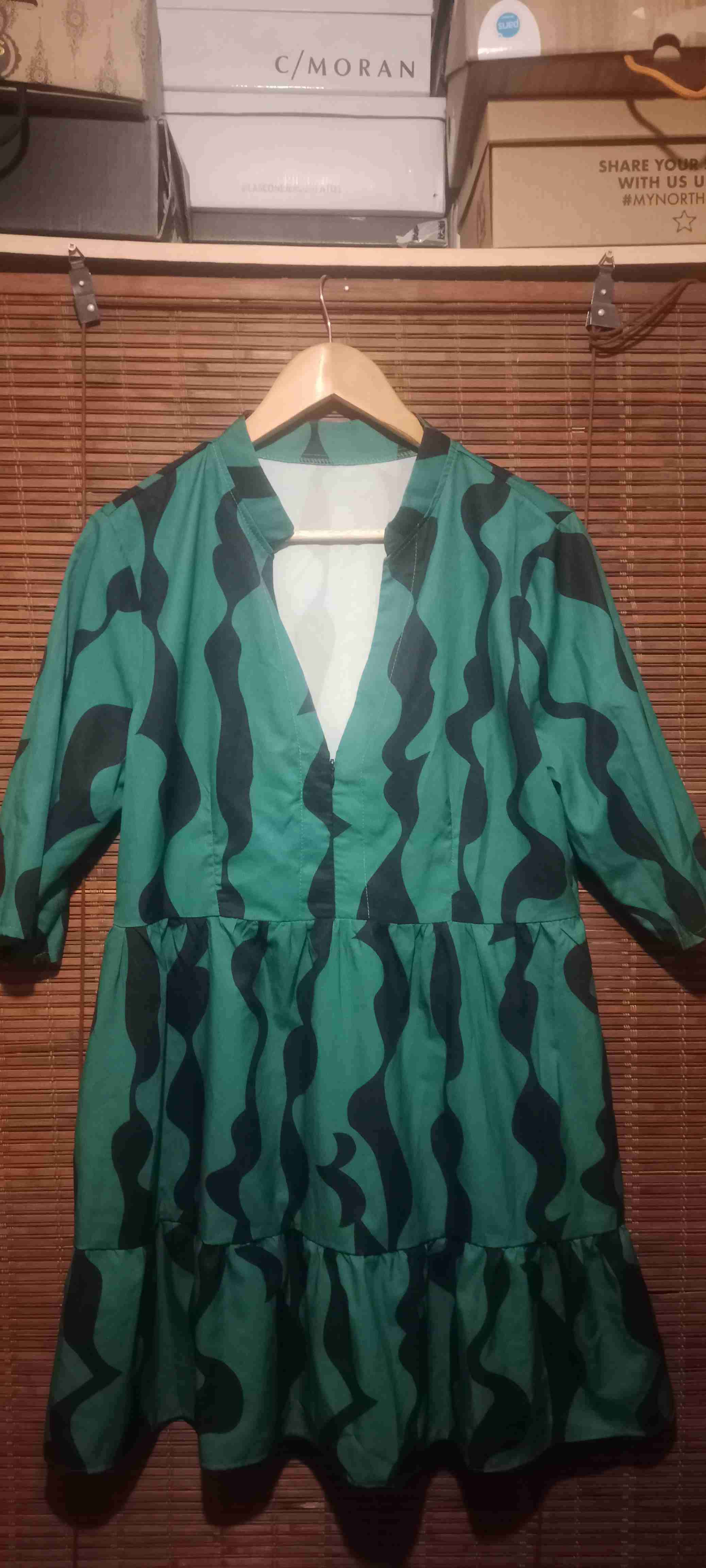 Vestido suelto verde con estampado ondulado. Ideal para ocasiones casuales, en buen estado general.