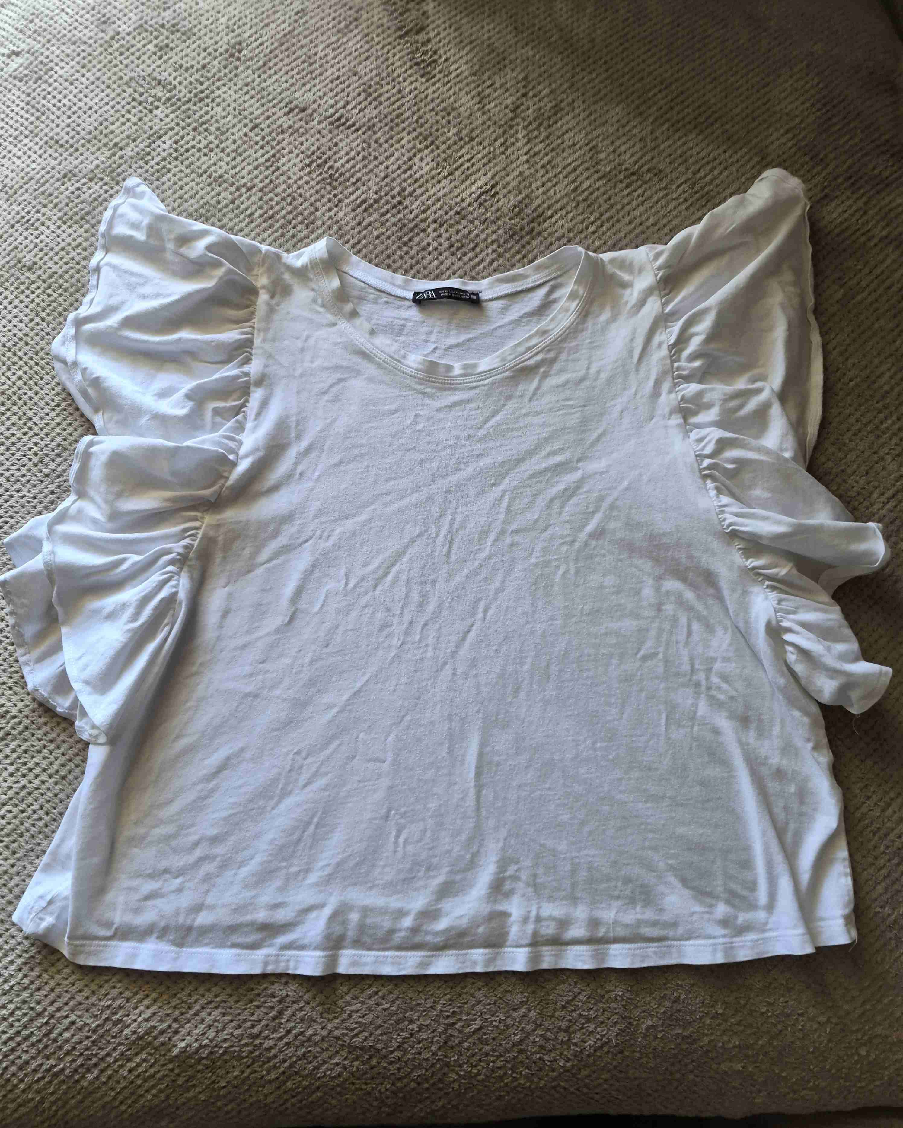 Polera blanca con volantes en los hombros, estilo casual y fresco. En buen estado, ideal para el verano. Tallada como XL pero equivale a M por el tamaño.