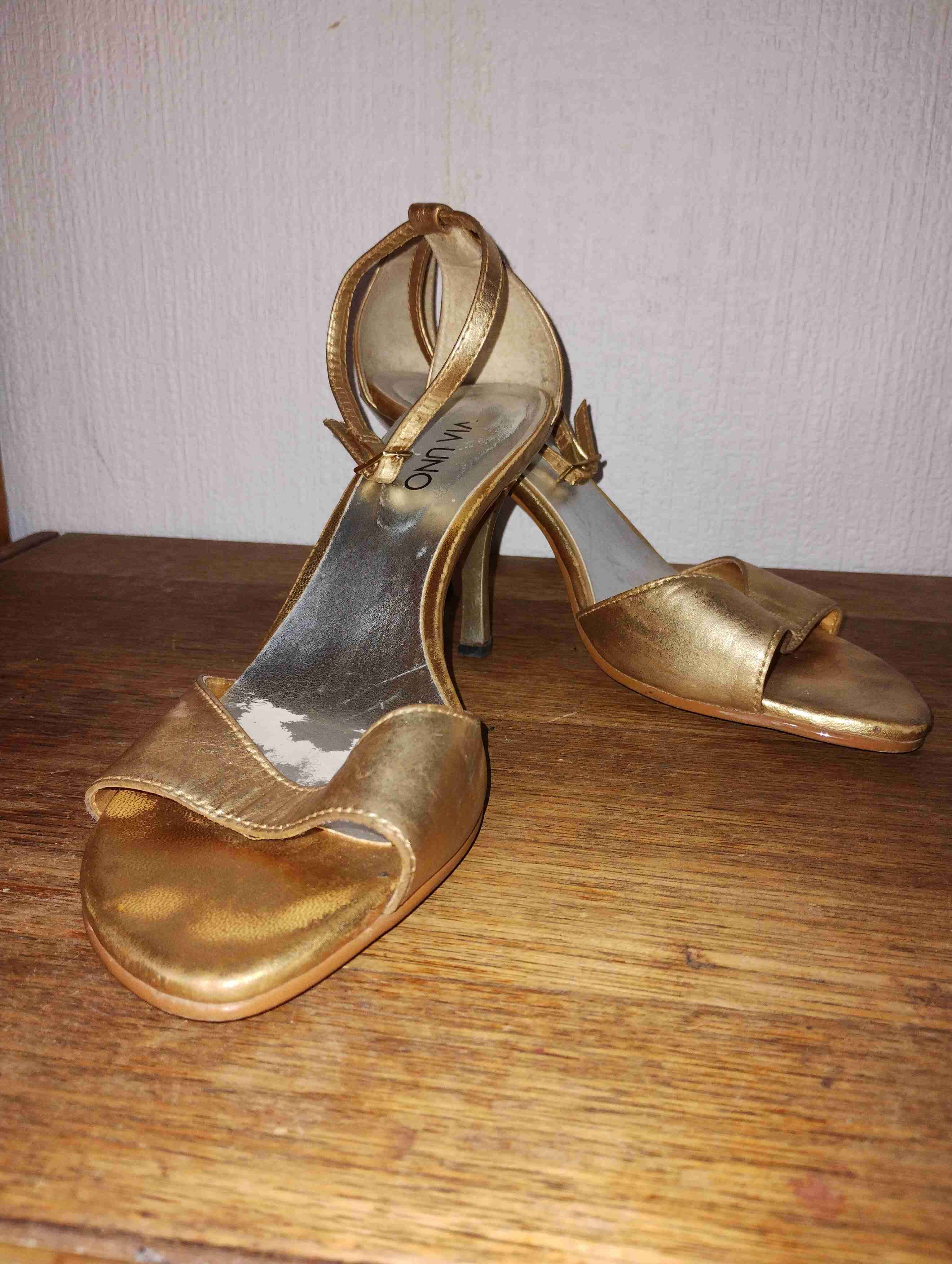 Elegantes tacones dorados con tiras. Usados, en buen estado con signos de uso. Perfectos para ocasiones especiales o fiestas.