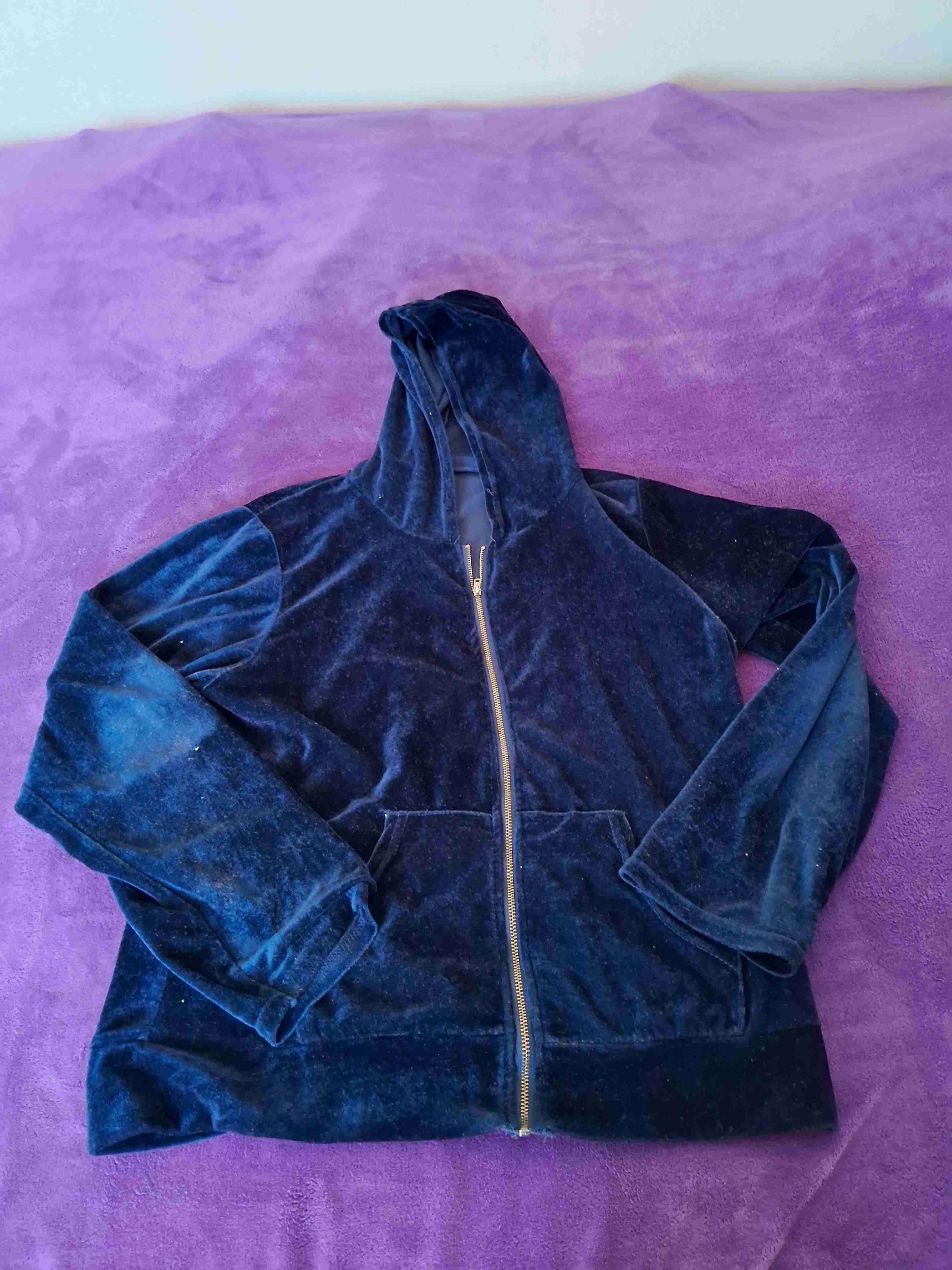 Buzo de terciopelo azul con cierre frontal y capucha, ideal para días fríos. Buen estado general.