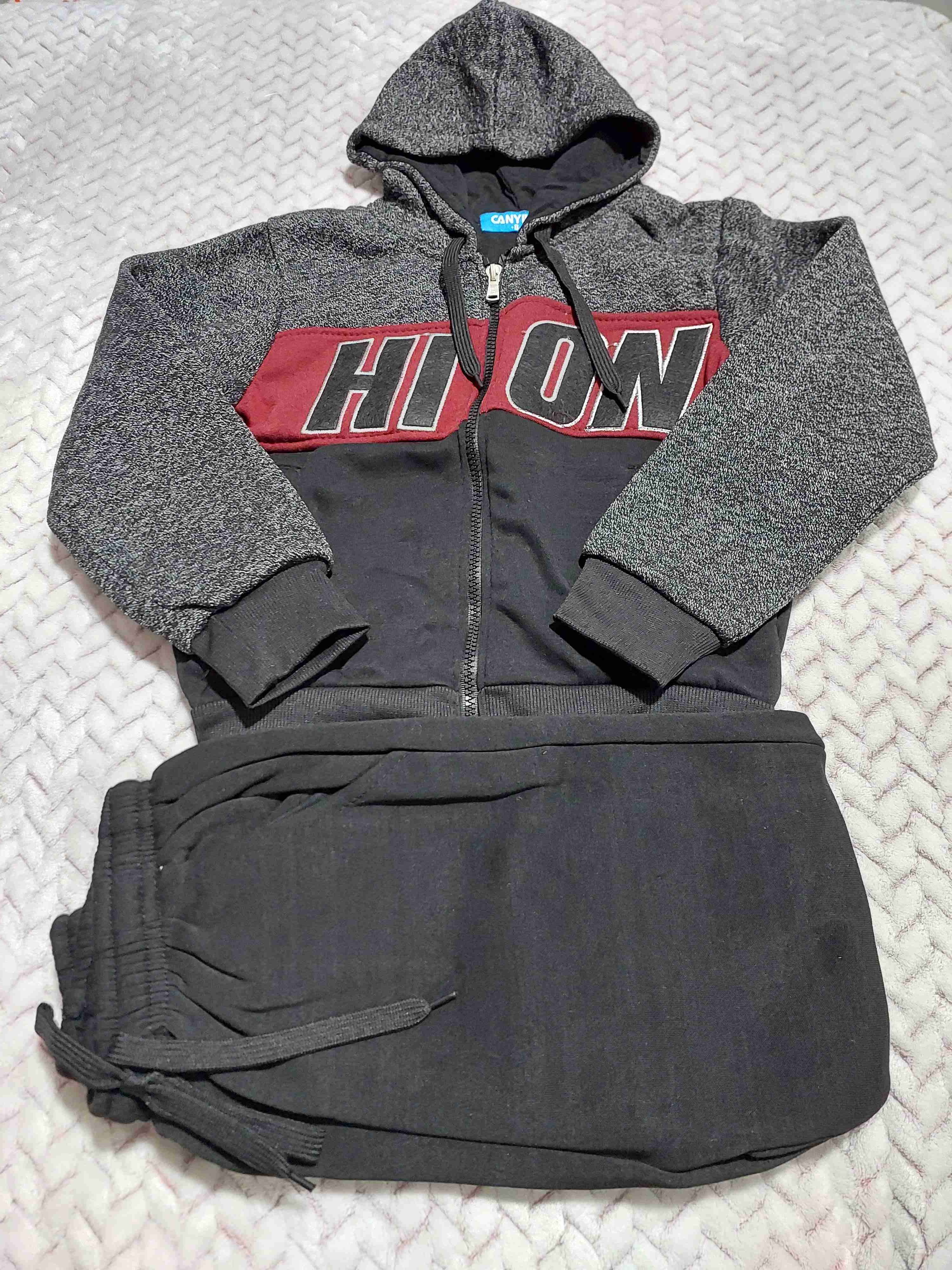 Conjunto de buzo gris y negro con capucha, ideal para el invierno. Talla 8.