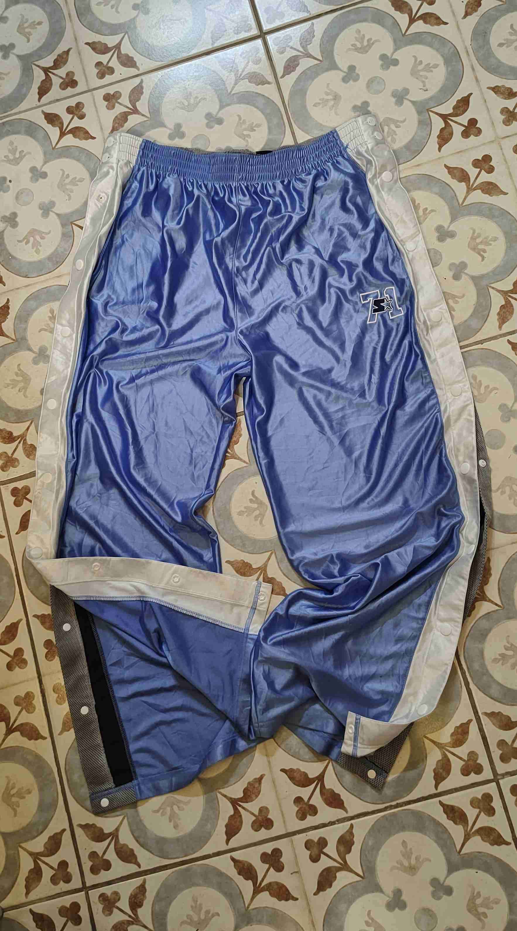 Pantalones deportivos azul brillante con detalle de botones laterales. Ideal para entrenar o uso casual. Buen estado general.