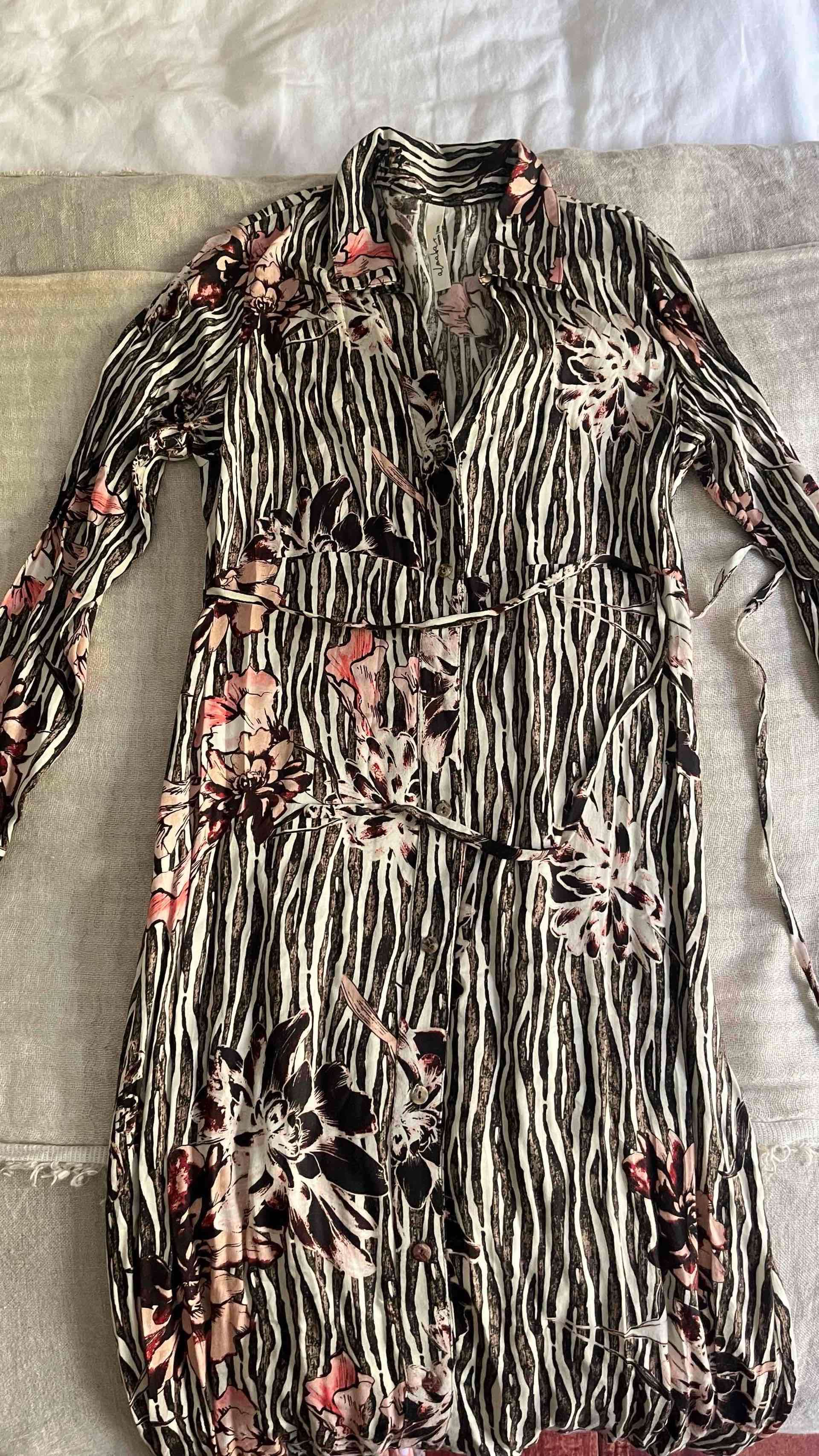 Vestido de mangas largas con estampado de flores y rayas, ideal para un look casual. En buen estado, perfecto para primavera.