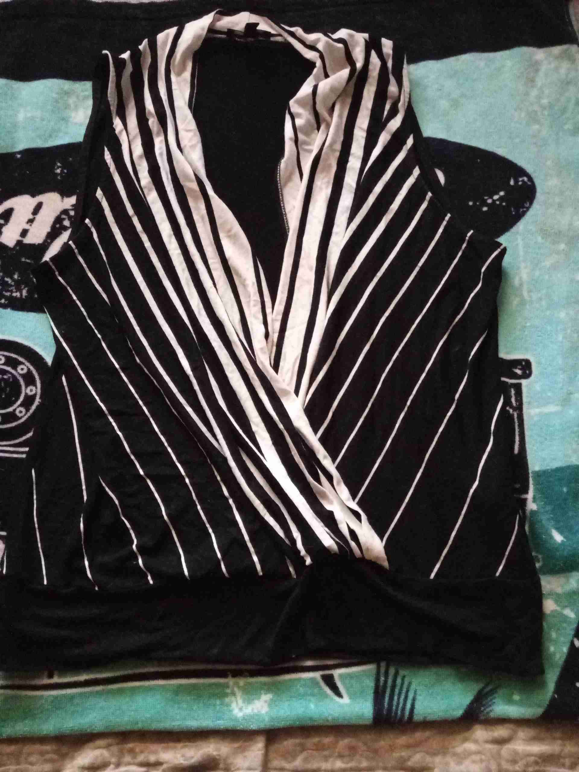 Blusa sin mangas elegante con diseño rayado en blanco y negro. Perfecta para eventos formales o salidas casuales. En buen estado.