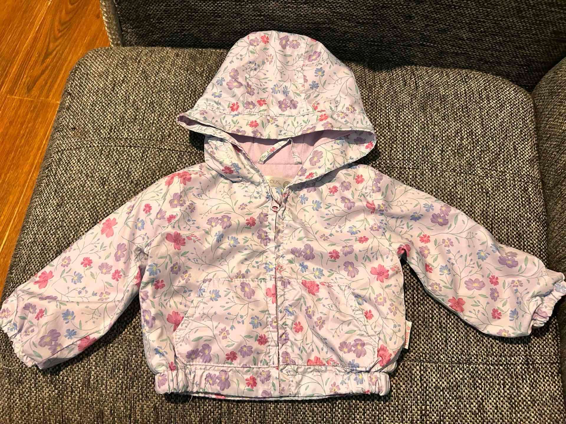 Linda chaqueta con diseño floral y capucha, ideal para lluvia. En buen estado, color lila.