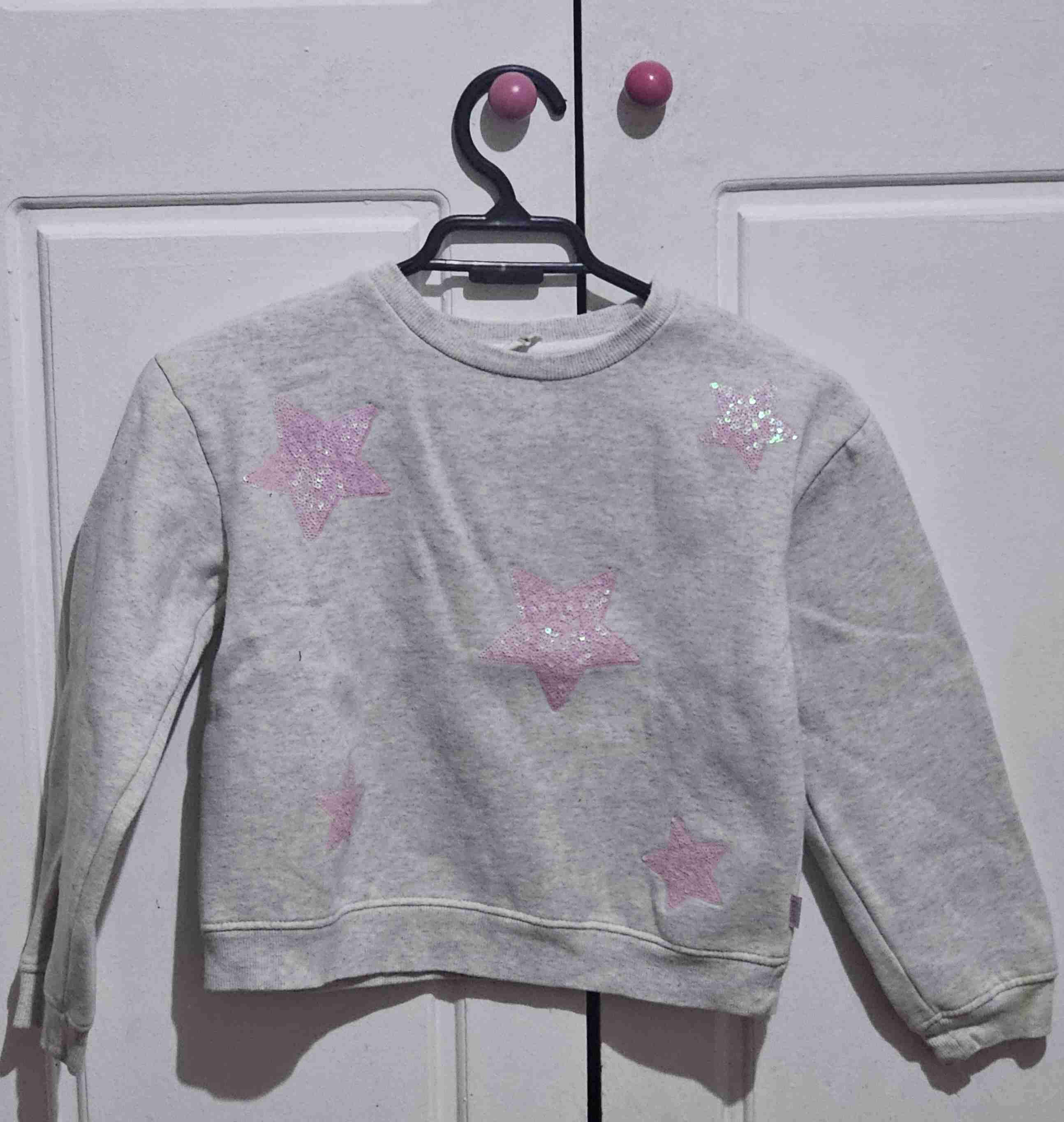 Polerón para niña en tono gris con estrellas rosadas brillantes. Ideal para el día a día, en buen estado general.