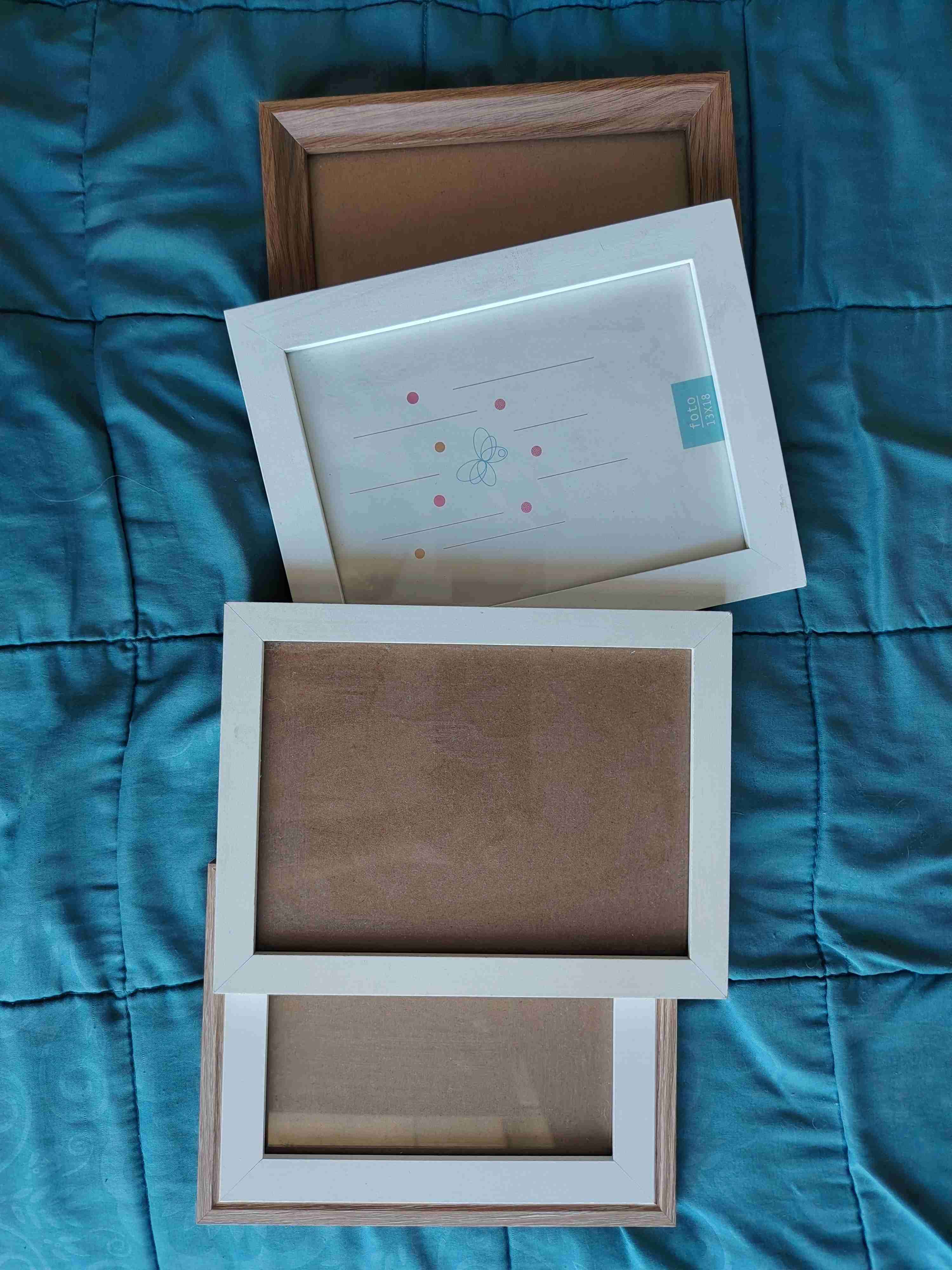 Cuatro marcos de fotos, tres blancos y uno de madera, ideal para decorar salas o dormitorios. Buen estado general.