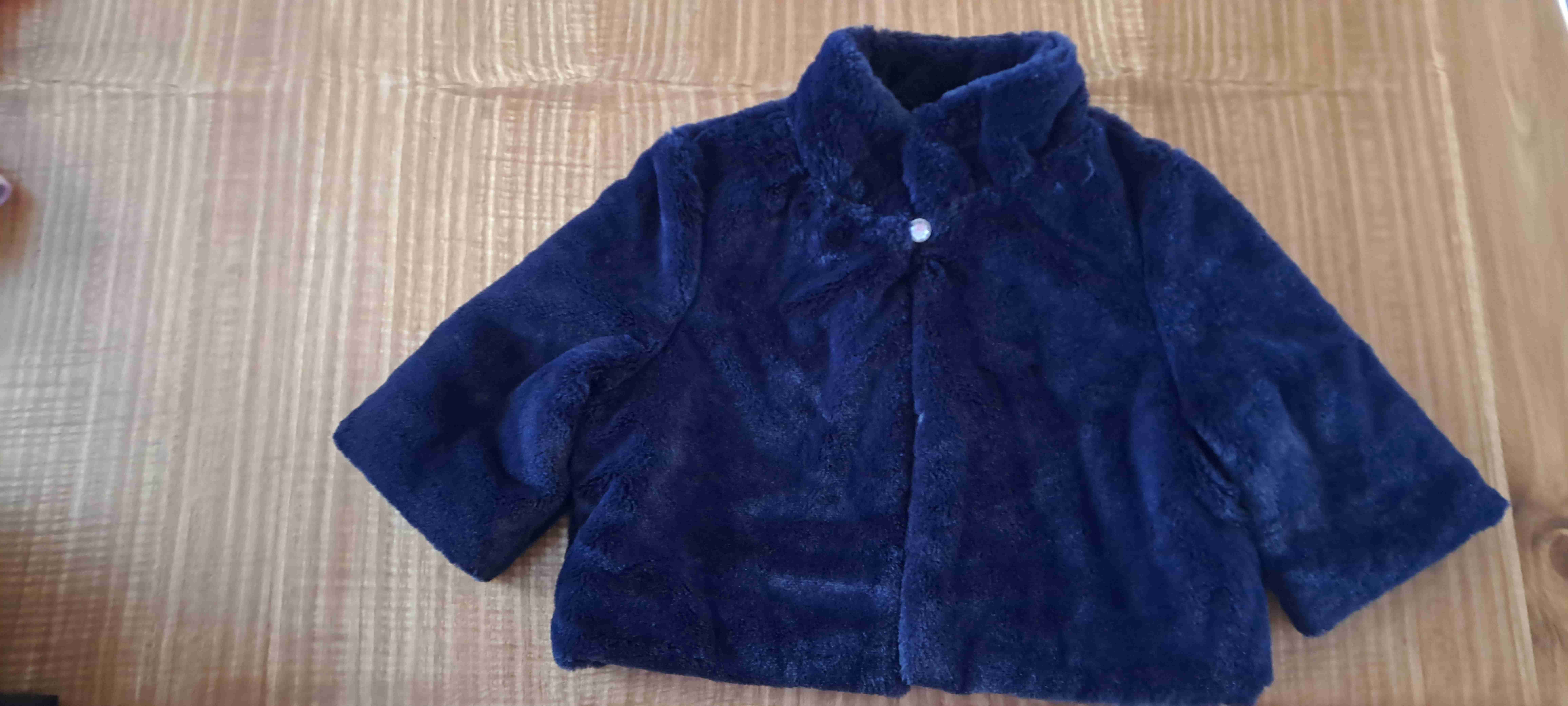 Abrigo de peluche suave en color azul oscuro. Ideal para mantenerte abrigado en los días fríos. Se encuentra en buen estado general, con cierre de botón, mangas 3/4