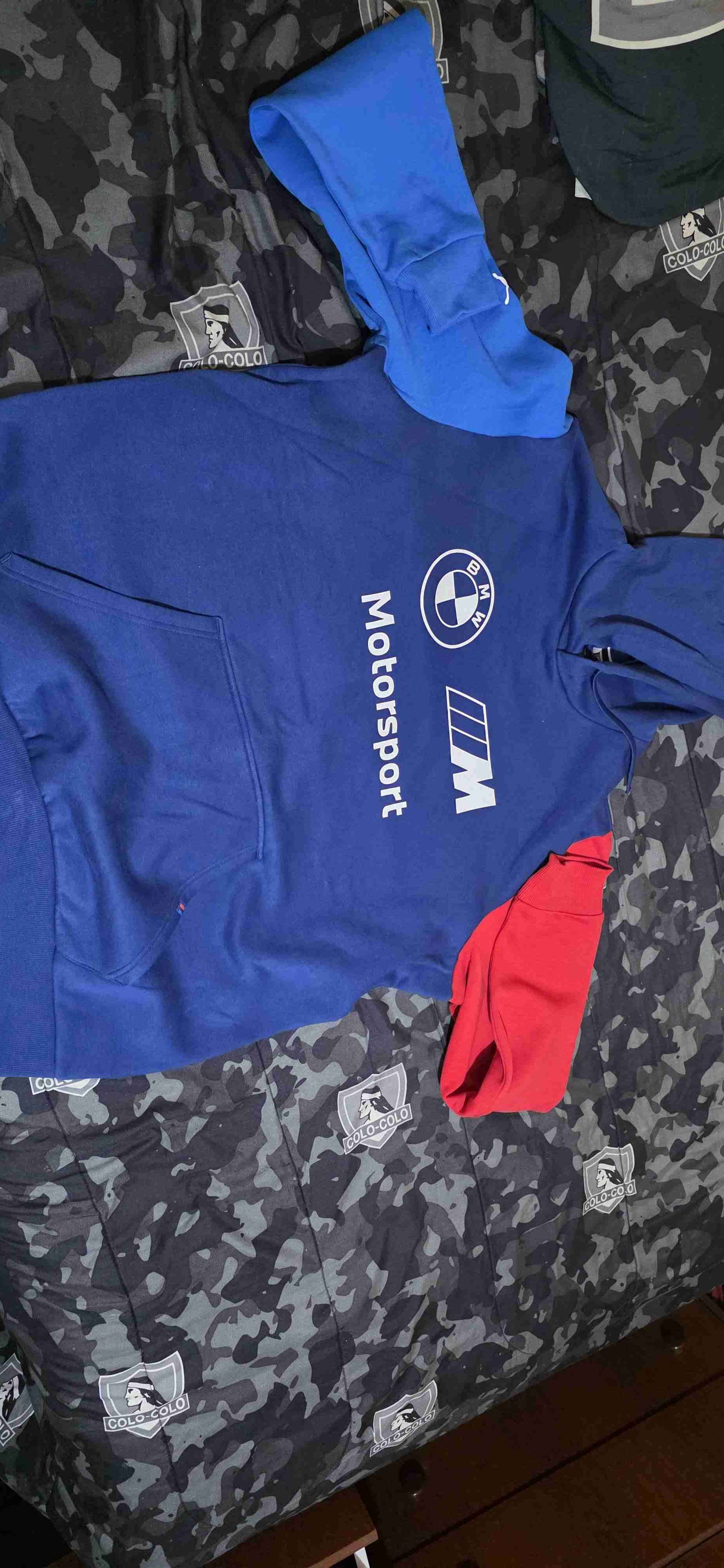Polerón azul de BMW Motorsport con capucha, perfecto para aficionados del automovilismo. En buen estado, ideal para uso casual.