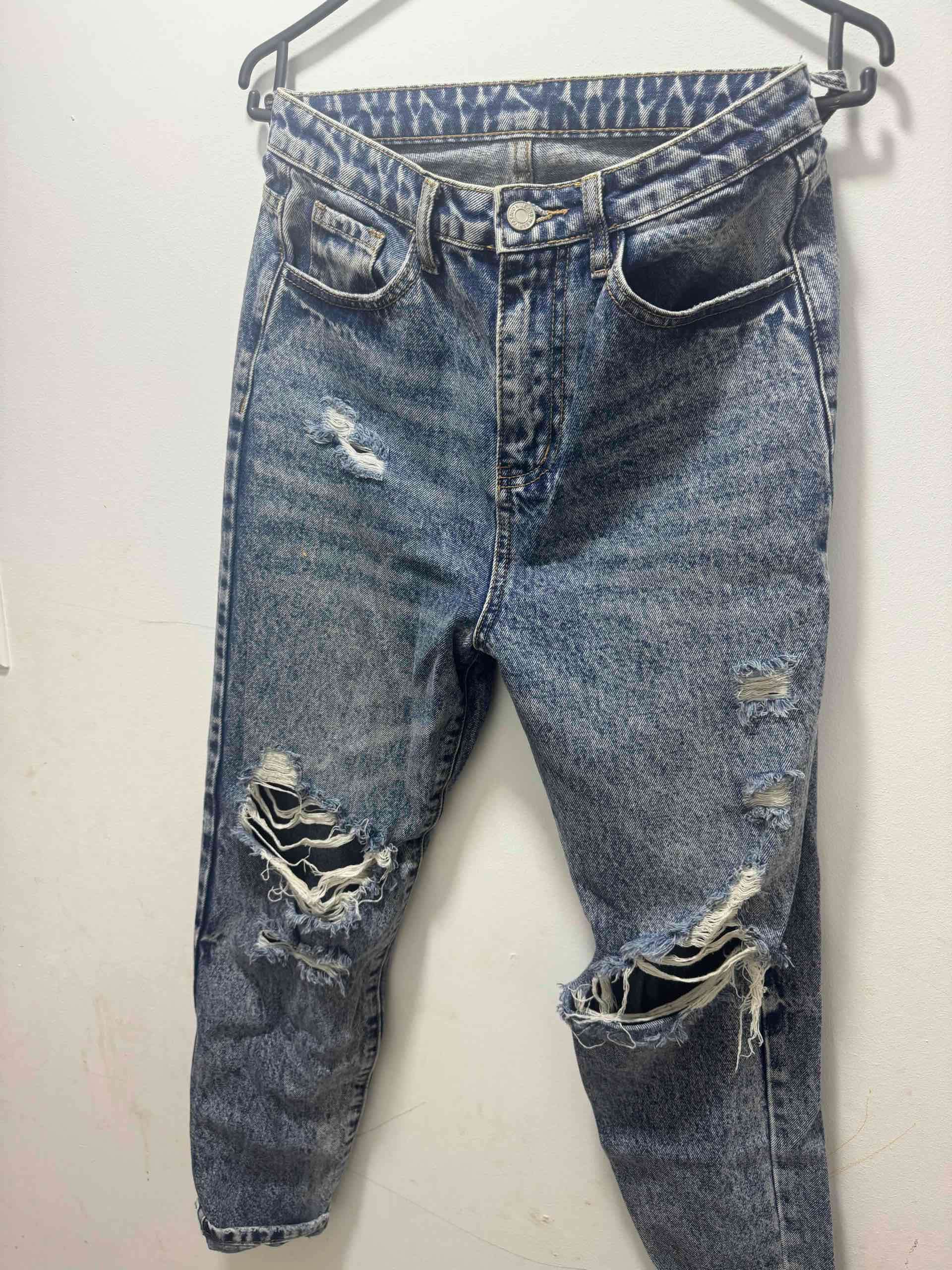 Jeans azules con diseño desgastado y roturas rígido . Estilo casual y en buen estado.