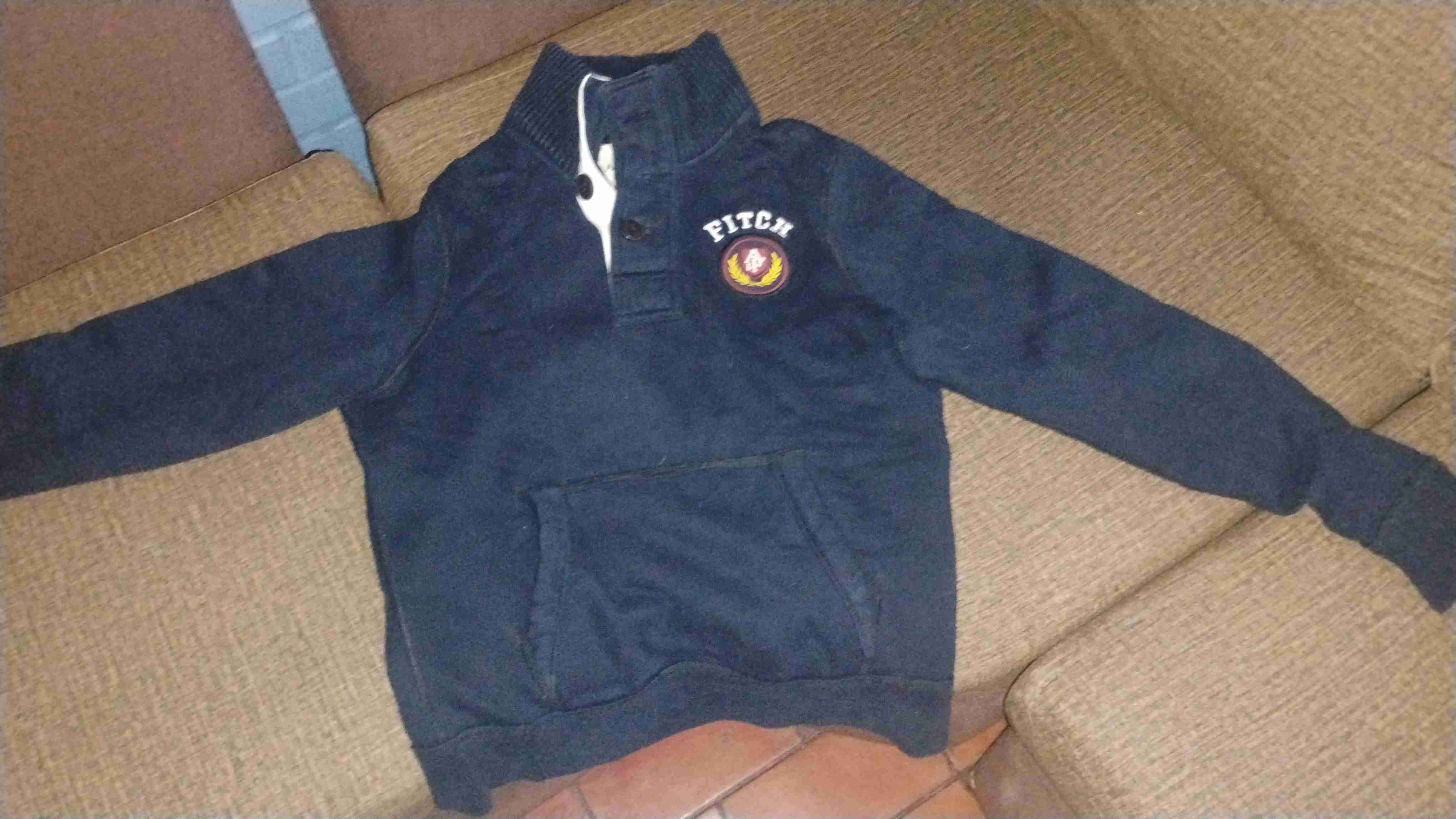 Polerón azul oscuro con cuello alto y bolsillo delantero. Ideal para días fríos. Buen estado con pequeñas señales de uso.
