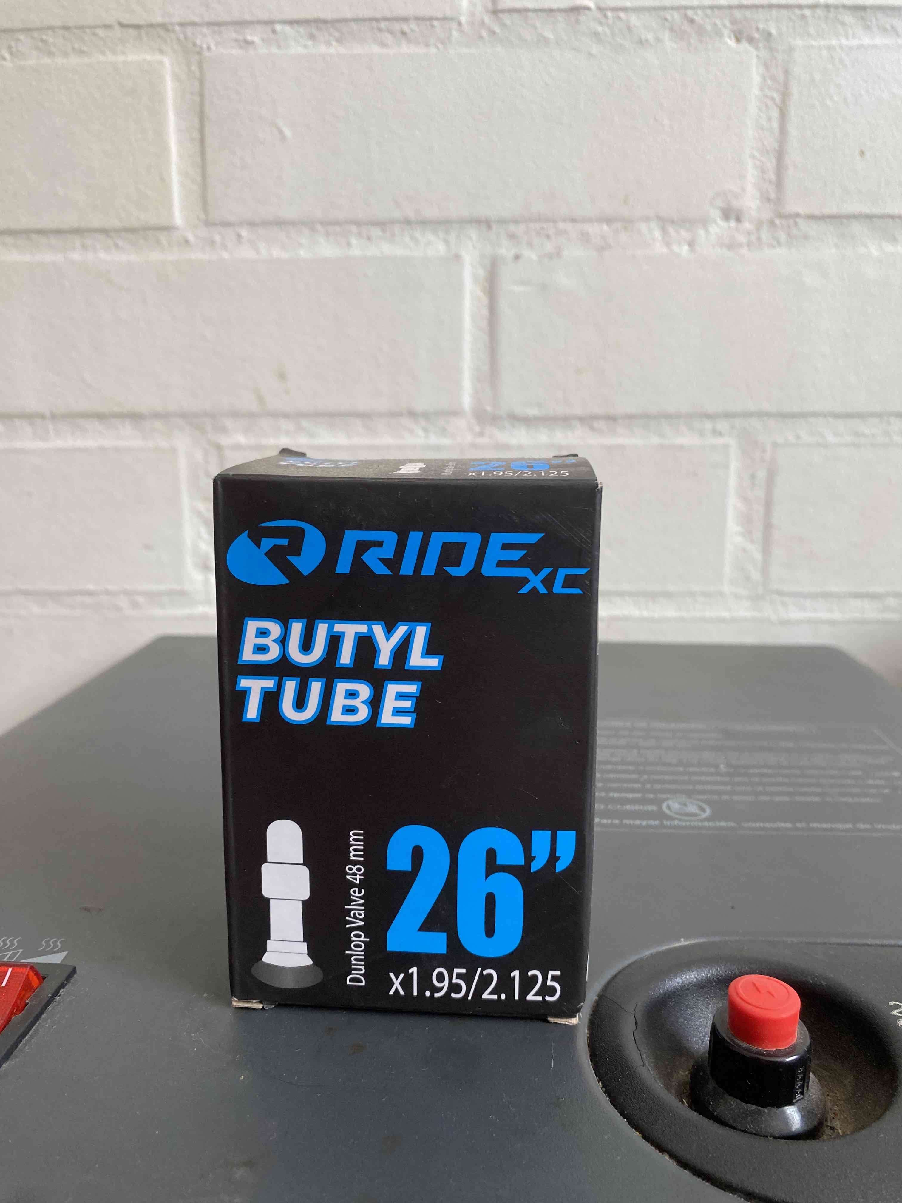 Cámara para bicicleta aro 26 con válvula Dunlop. Ideal para reemplazo o reparación.