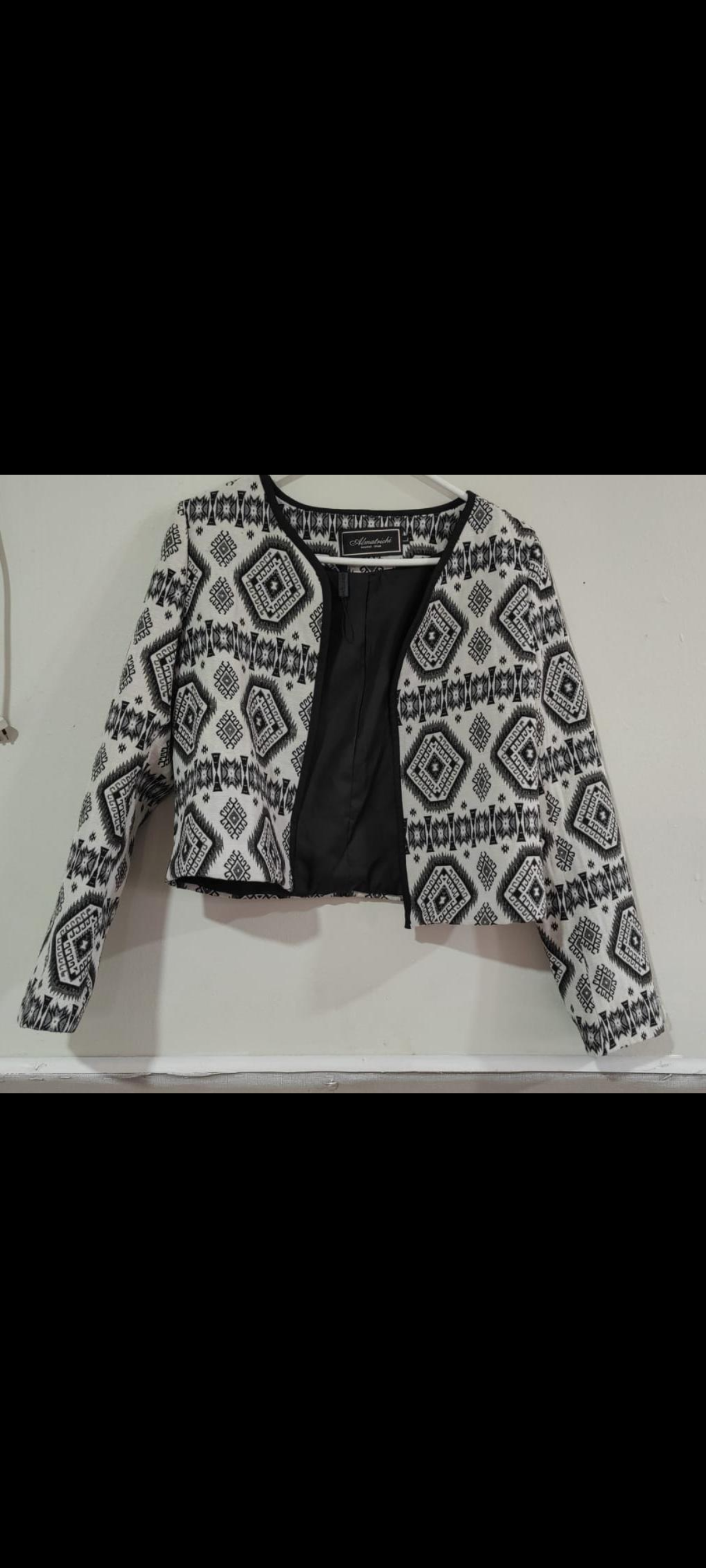 Chaqueta corta estilo bohemio con estampado geométrico en blanco y negro. En buen estado, ideal para complementar outfits casuales.