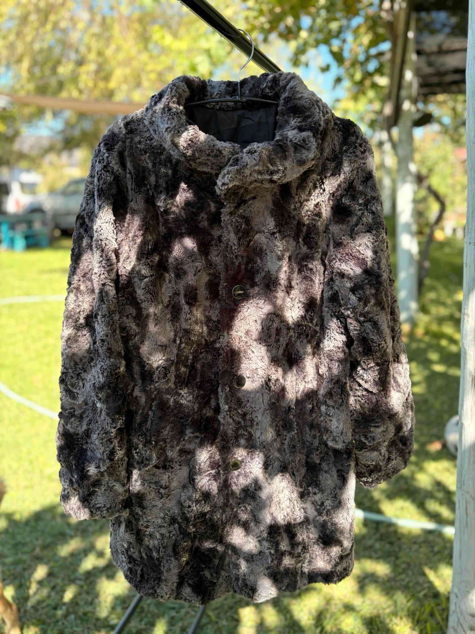 Elegante abrigo de piel sintética en color gris oscuro, perfecto para el invierno. En buen estado general, ideal para lucir sofisticada.