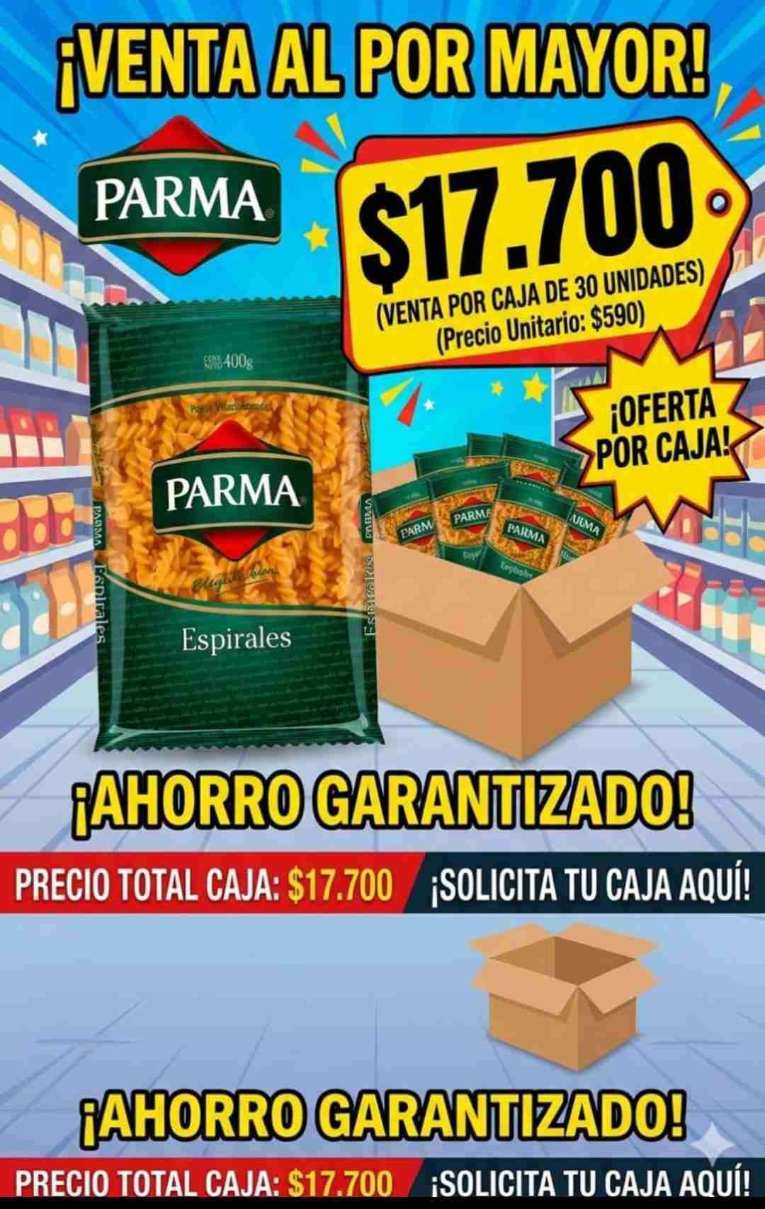 Caja de 30 unidades de pasta espirales Parma. Ideal para compradores al por mayor. ¡Aprovecha la oferta! Tel: 9 6223 6970