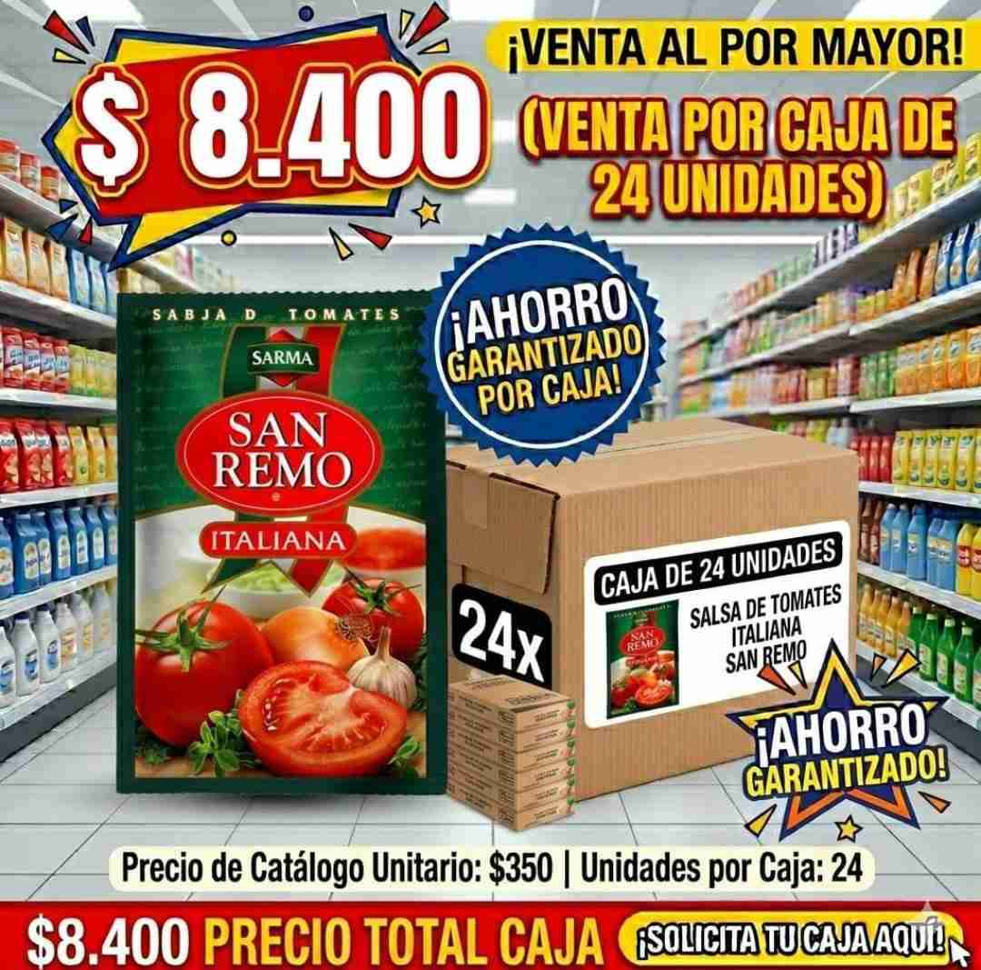 Caja con 24 unidades de salsa de tomates San Remo. Ideal para uso en cocina profesional o familiar. Ahorro garantizado por caja. Tel: 9 6223 6970