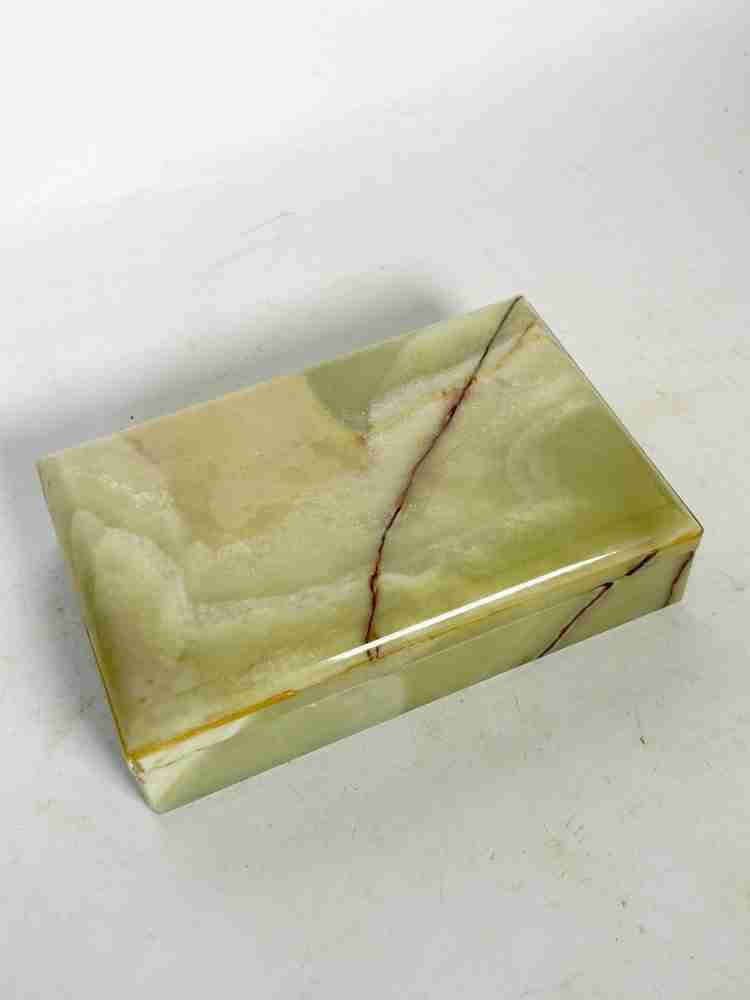 Caja de Onix color verde-amarillo con vetas, ideal para decoración o almacenamiento de joyas. En buen estado. Este producto Vintage no tiene defectoa, pero puede presentar marcas de uso leves Fabricado en Francia entre 1970 y 1979. Medidas ancho 18 cm. Profundidad 12 cm. Altura 5 cm.