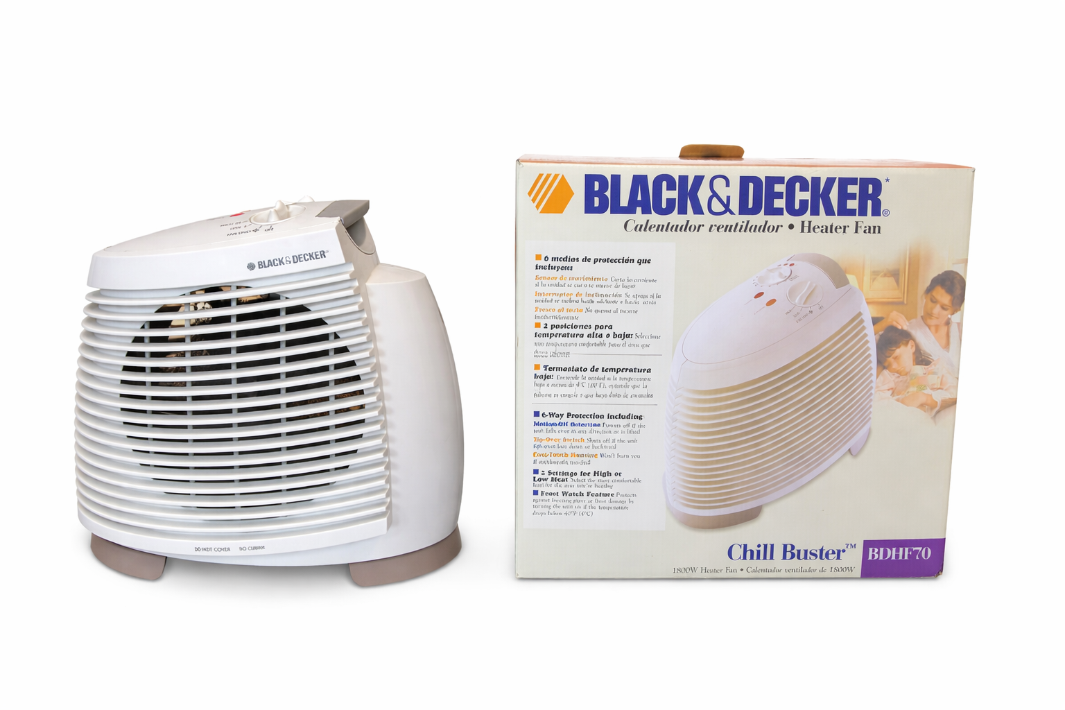 Calentador Ventilador NUEVO Black & Decker Chill Buster(Modelo BDHF70) Protección de 6 Vías (6-Way Protection) La caja destaca un sistema de seguridad integral que incluye: • Sensor de movimiento: Corta la corriente si la unidad se mueve de lugar. • Interruptor de inclinación: Apaga el equipo automáticamente si se cae hacia adelante o hacia atrás. • Fresco al tacto: La carcasa exterior está diseñada para no quemar si se toca accidentalmente mientras está funcionando. Rendimiento y Control • 2 Posiciones de temperatura: Permite elegir entre calor Alto (High) o Bajo (Low) según la necesidad del área. • Termostato ajustable: Incluye una perilla en la parte superior para regular el nivel de calor. • Potencia: Es un calentador de 1800 W • Función de ventilador: Además de calentar, cuenta con un modo de Solo Ventilador para circular aire sin activar las resistencias de calor.