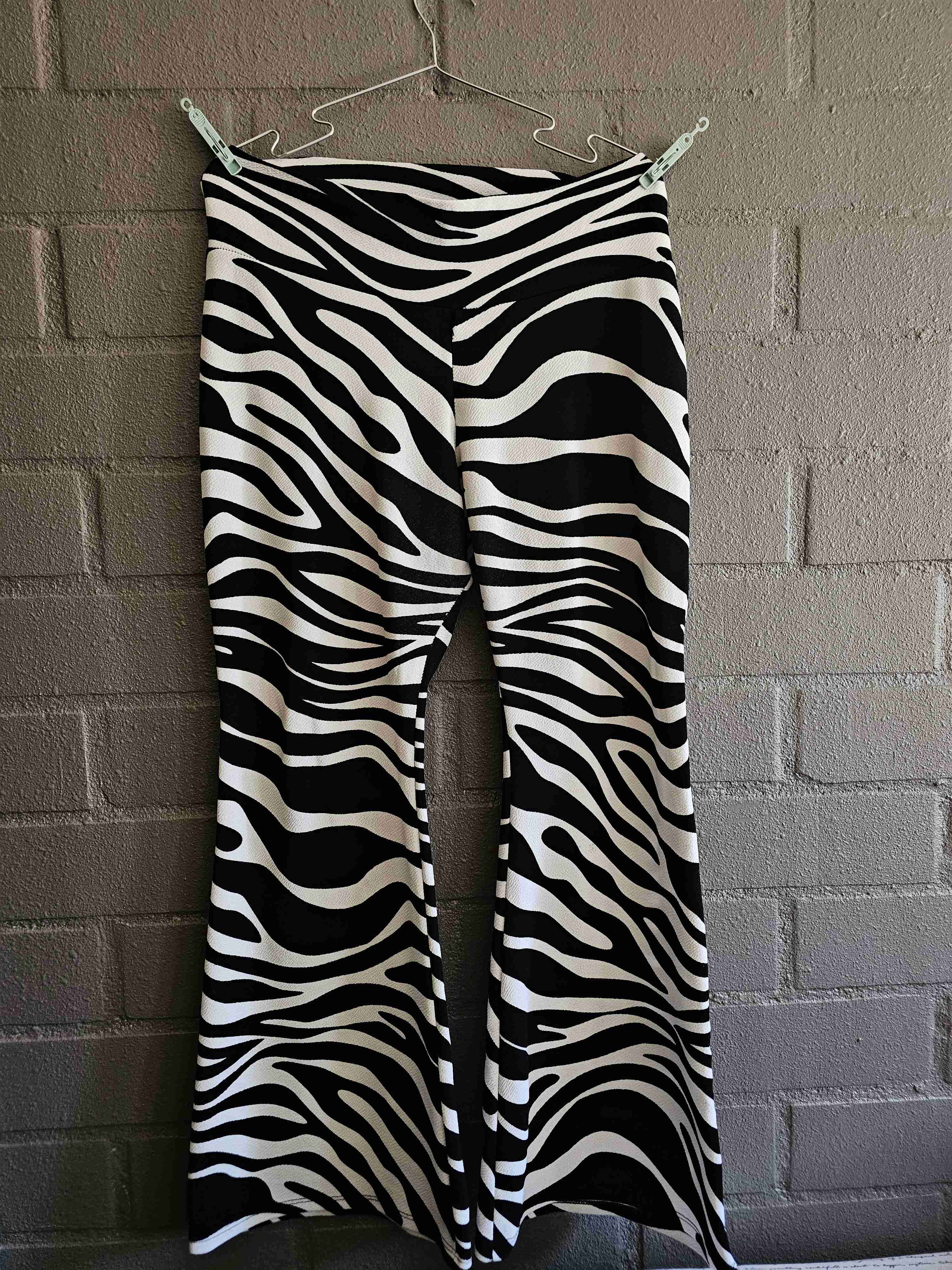 Calzas acampanados con estampado de cebra en blanco y negro. Perfectos para un look audaz y moderno. Con detalle en una costura que se arreglo pero se nota.