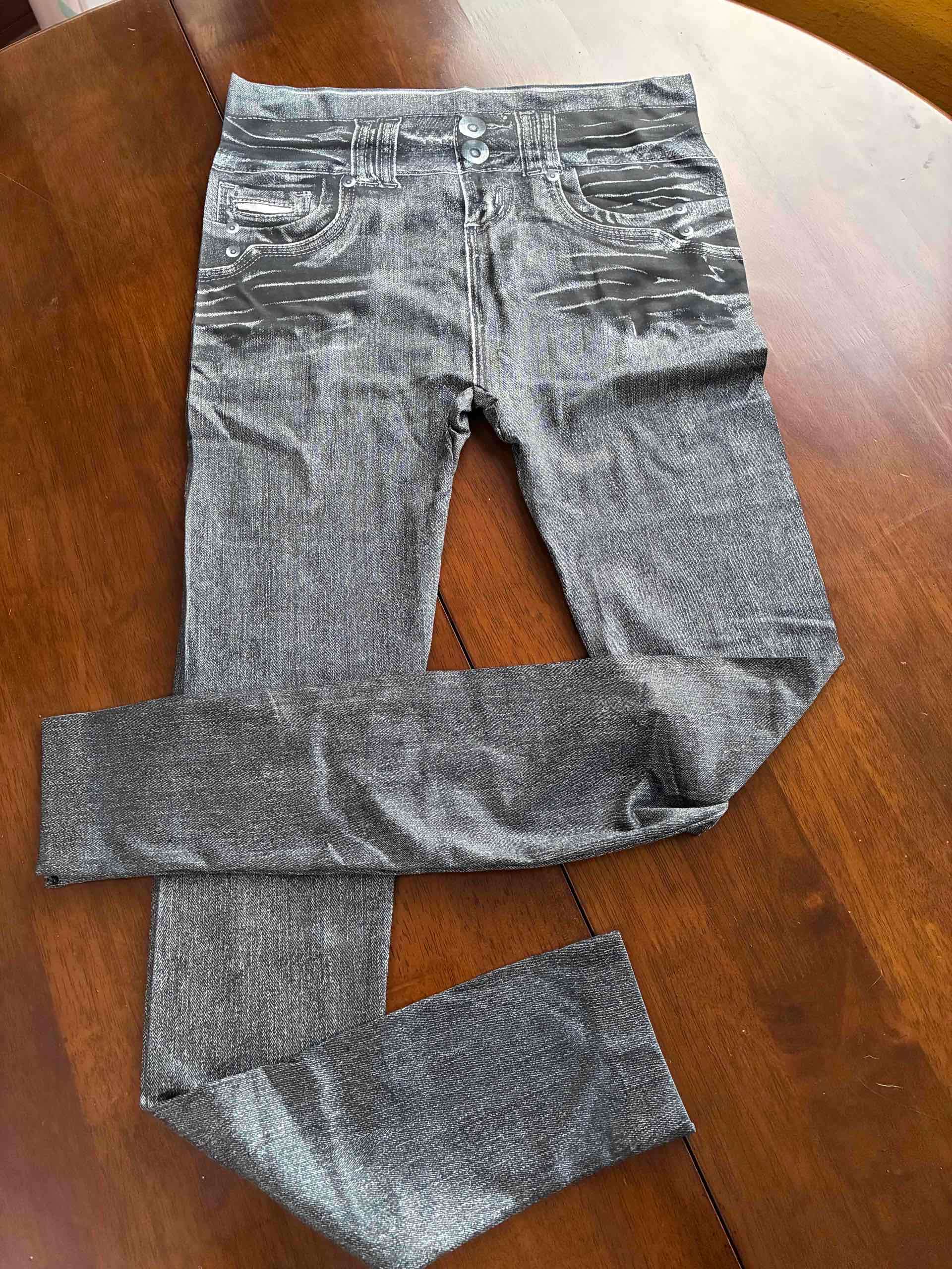 Calzas estilo jeans desteñido, delgadas, elasticadas, ideal para lucir a la moda y hacer deporte. En buen estado general, sin uso. NO son de mezclilla. Colores negro, gris y azul. Talla única (homologable con S-M). Se venden las 3 calzas por el precio publicado.