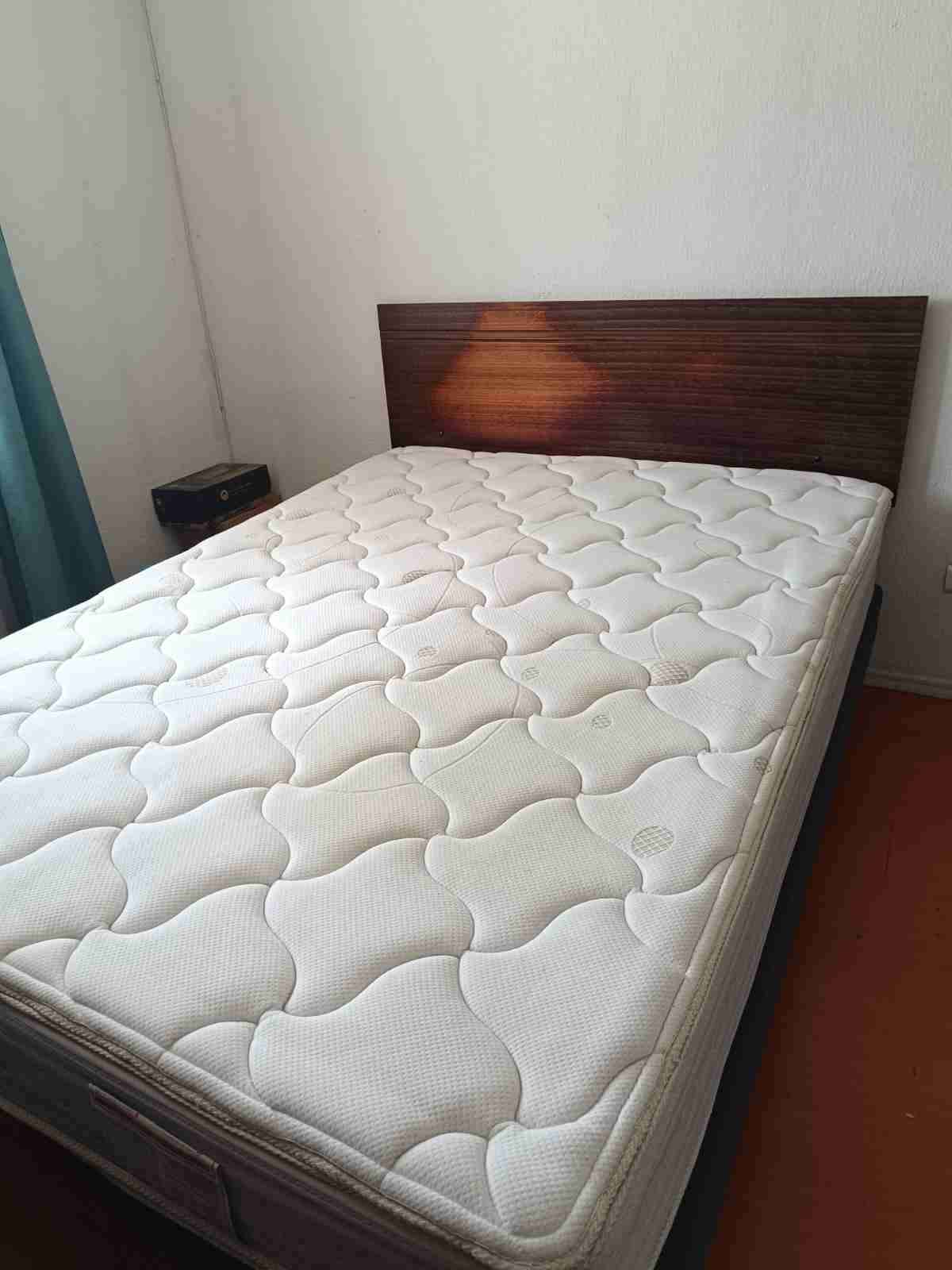 Cama matrimonial con colchón de resortes, cabecera de madera y dos veladores. En buen estado, ideal para dormitorio principal.