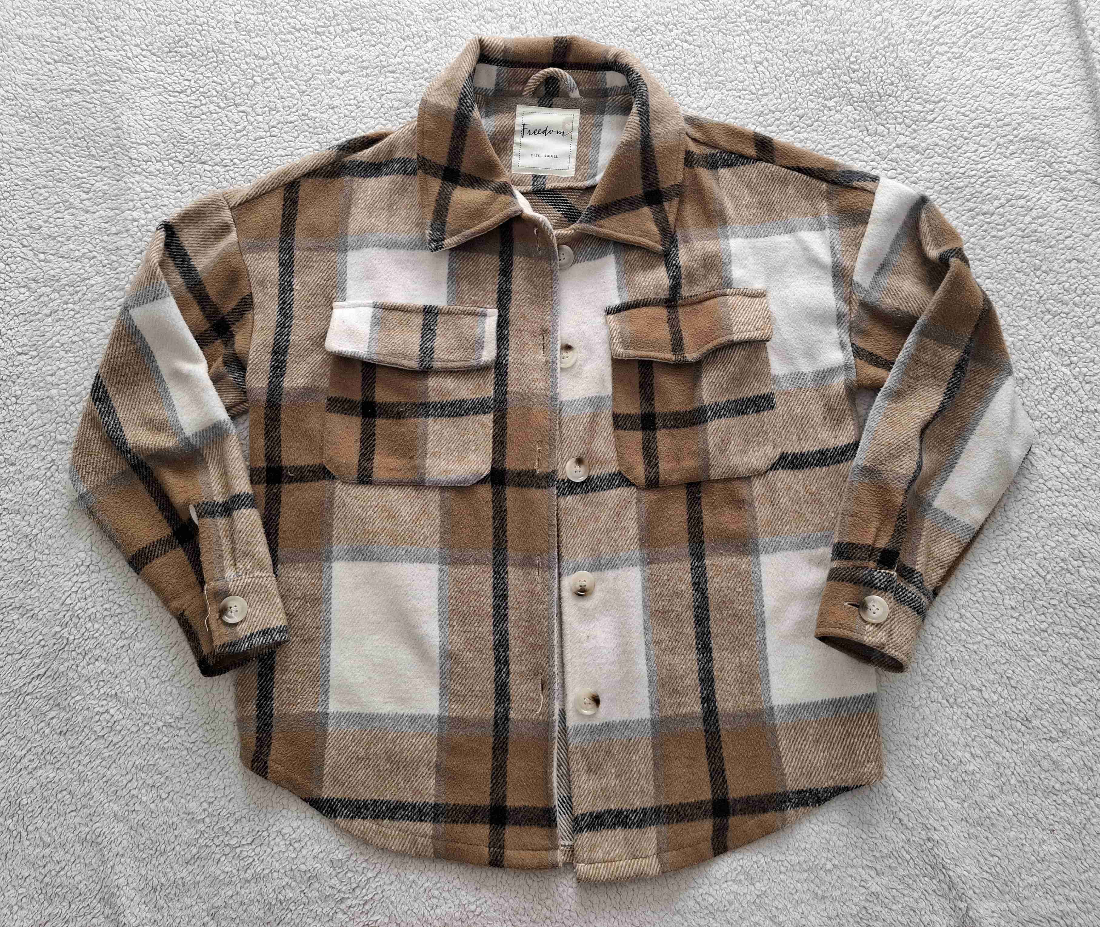 Camisa de cuadros estilo leñador, color marrón y beige, ideal para el invierno. En buen estado con ligeros signos de uso.