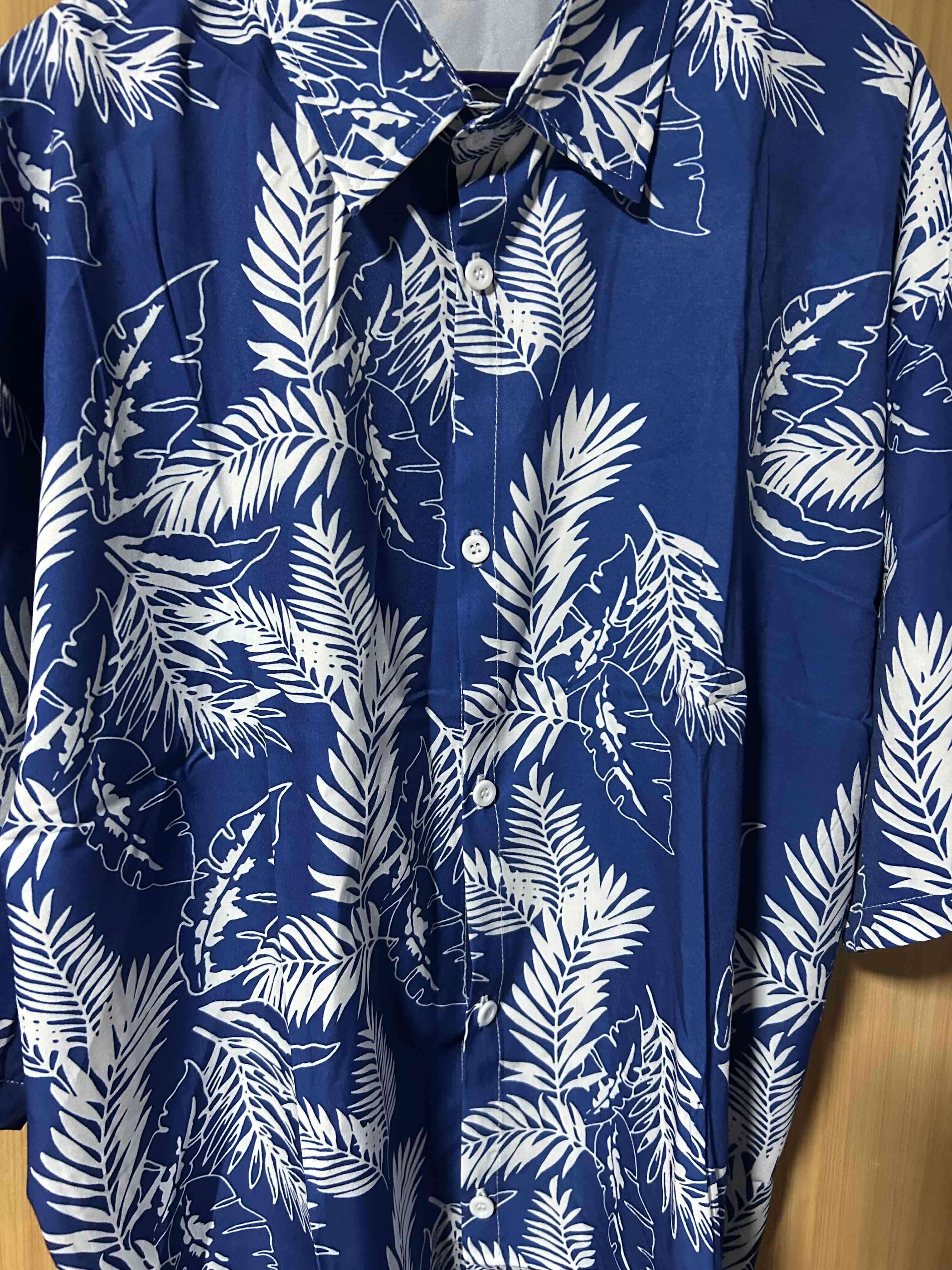 Camisa de estilo hawaiano en azul con estampado de hojas blancas. Perfecta para días casuales y relajados. En buen estado. Talla 3XL